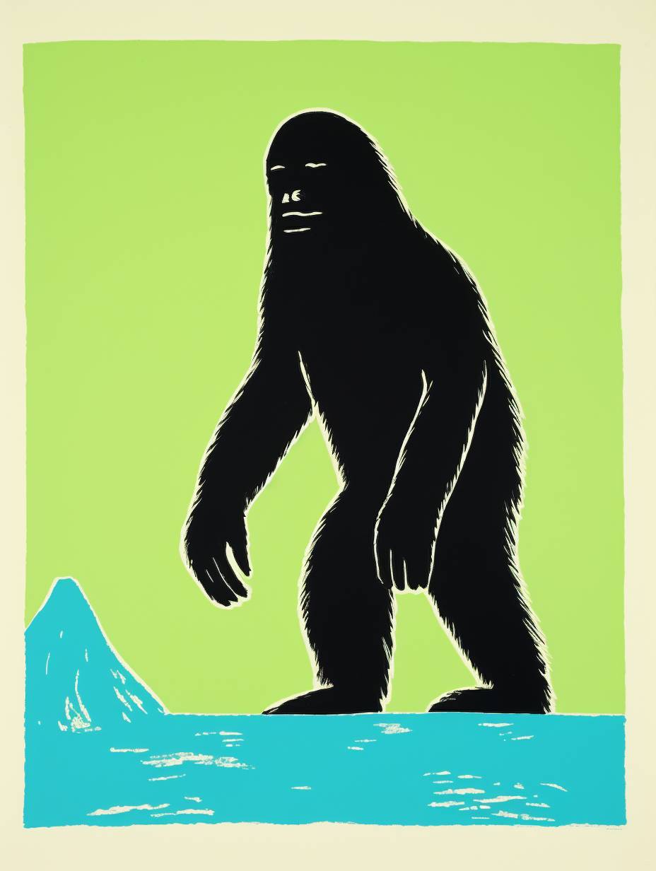 ビッグフット、シルクスクリーン印刷、レトロポスターアート、ミルトン・エイブリースタイル、シンプル/ミニマル、1960年代、明るくて活気のある、ファンキー/グルーヴィー、雲のような/膨張した形、平らな形、シンプル/ミニマル、手作りのアート、無地の背景