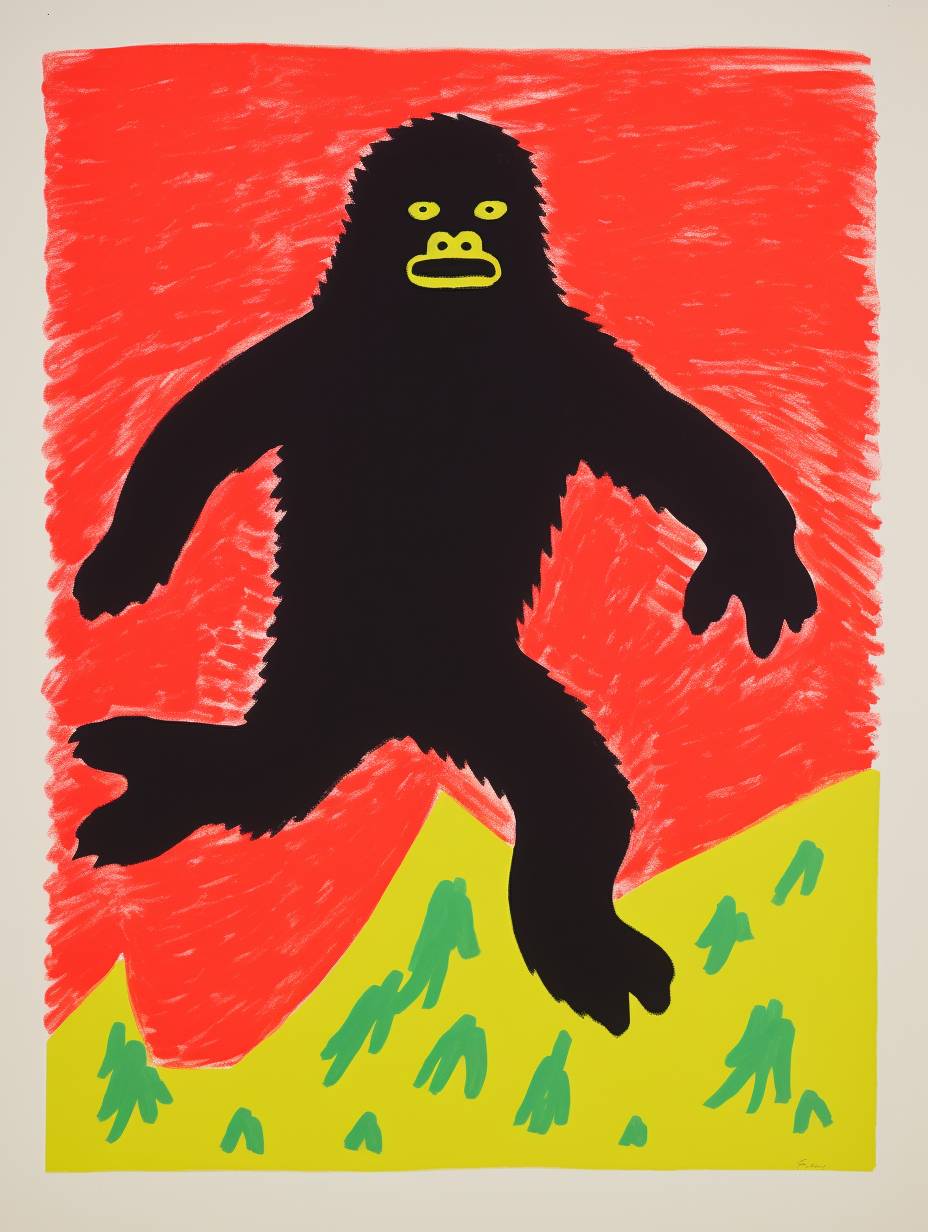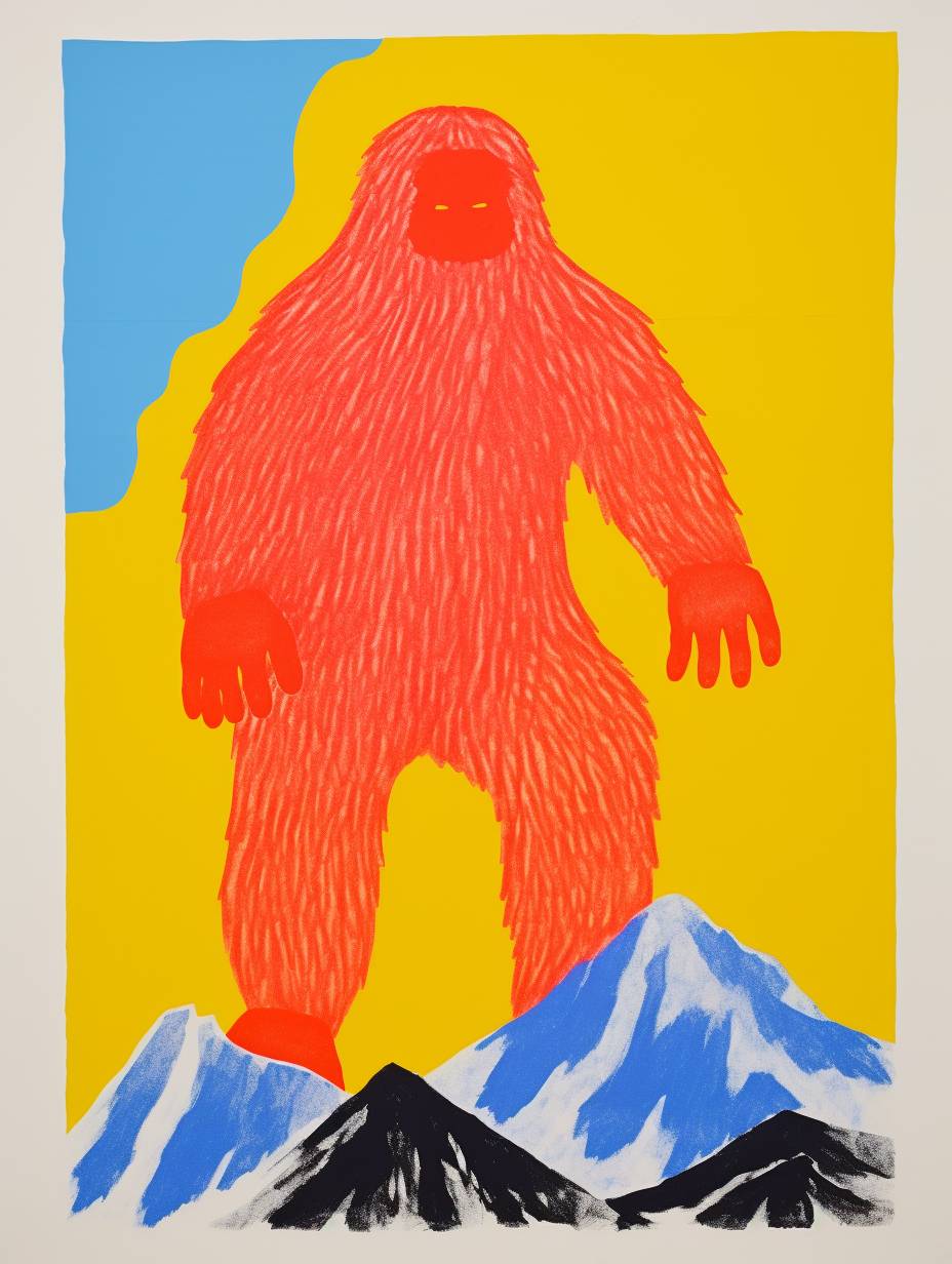 Sasquatch, silkscreen printing, retro poster art, Milton Avery style, simple/minimal, 1960's, bright and vibrant, funky/groovy, cloudy/bloated forms, flat shapes, simple/minimal, hand-crafted art, plain background --ar 3:4 --stylize 50 --v 5.2