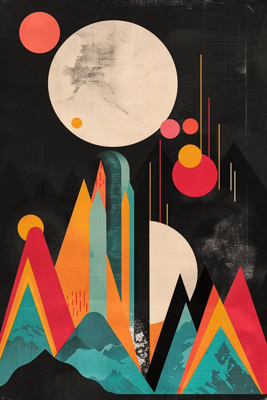 In the style of Wassily Kandinsky, create an arch of Triumph of Aosta Valley in italy with a elegant black background featuring rounded shapes brights colors. Include elements like Mountains integrated into the design. --ar 2:3 --v 6.0