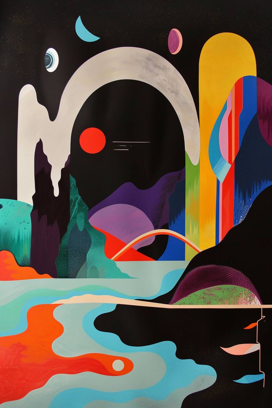 ワシリー・カンディンスキーのスタイルで、イタリアのアオスタ谷の凱旋門を描いてください。優雅な黒い背景に丸みを帯びた形と鮮やかな色を特徴としています。デザインに統合された山の要素を含めてください。