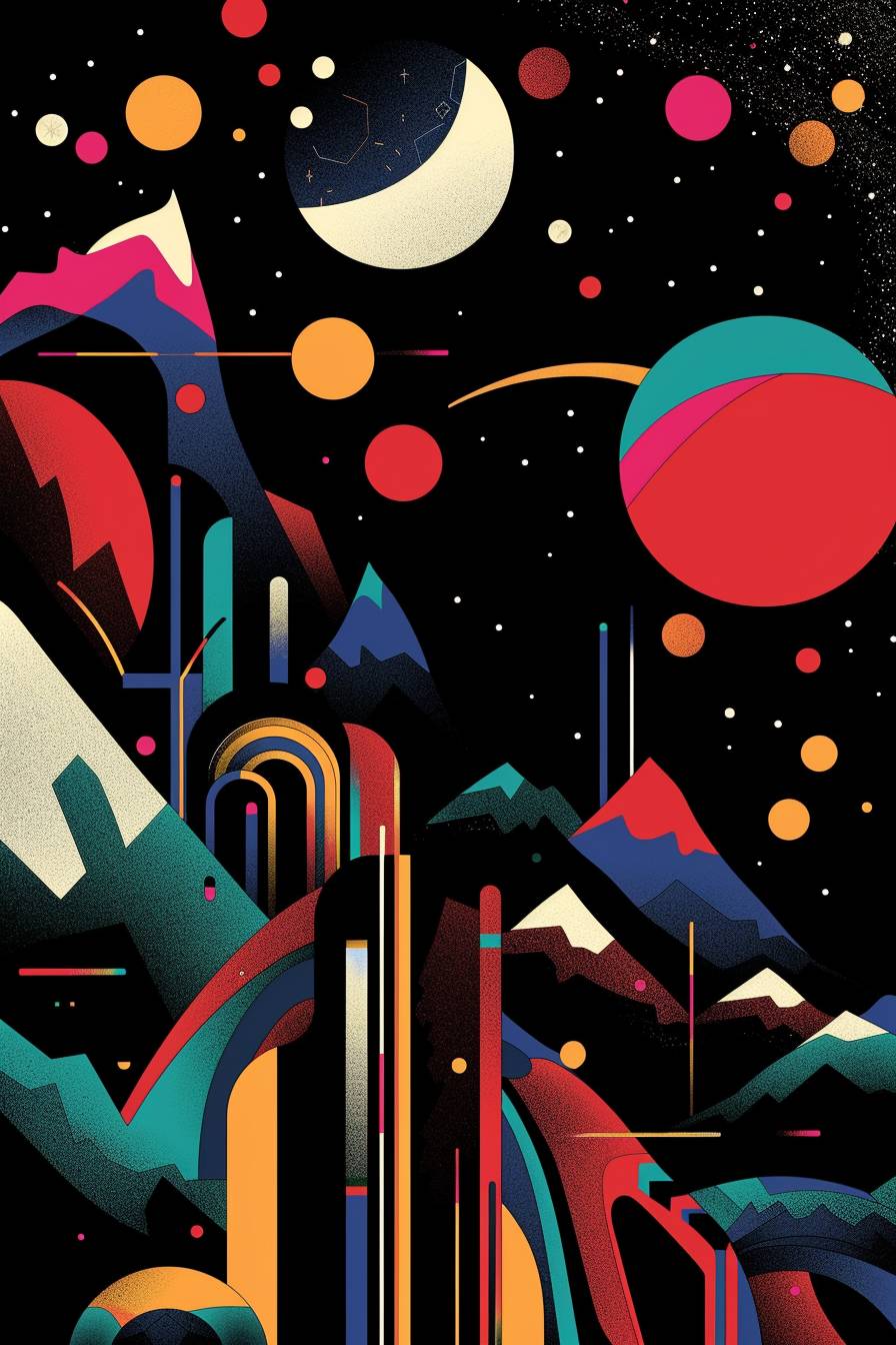 ワシリー・カンディンスキーのスタイルで、イタリアのアオスタ渓谷にある凱旋門を作成し、エレガントな黒背景に丸い形と明るい色を使用し、デザインに山を組み込む。