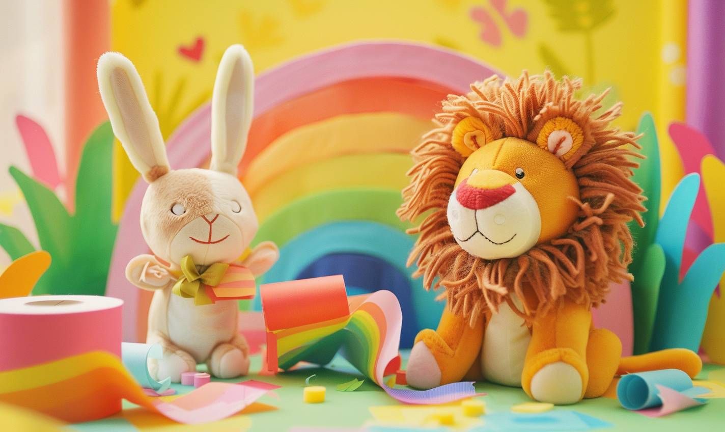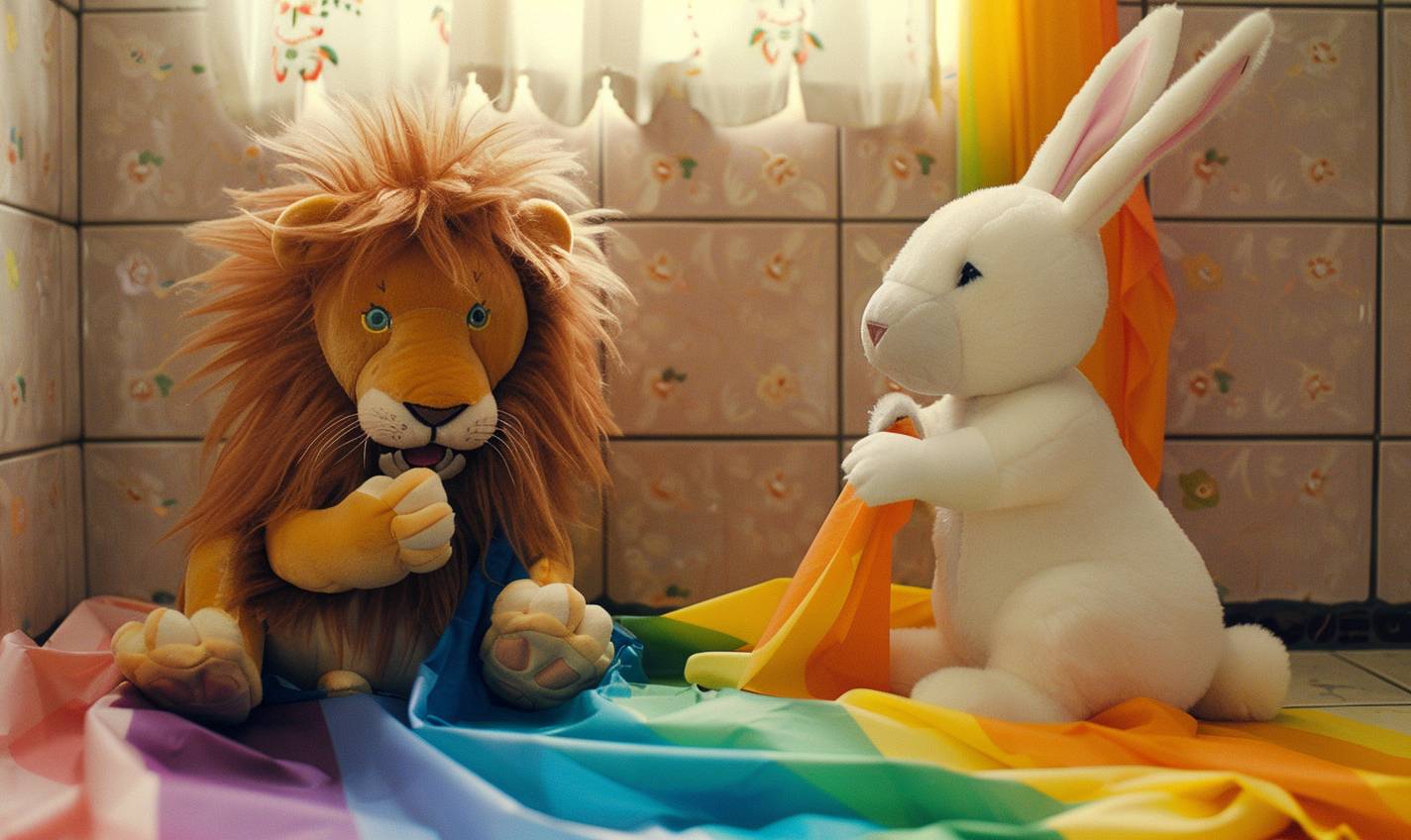 ライオンとバニーのぬいぐるみが、虹色のトイレットペーパーで遊んでいます!