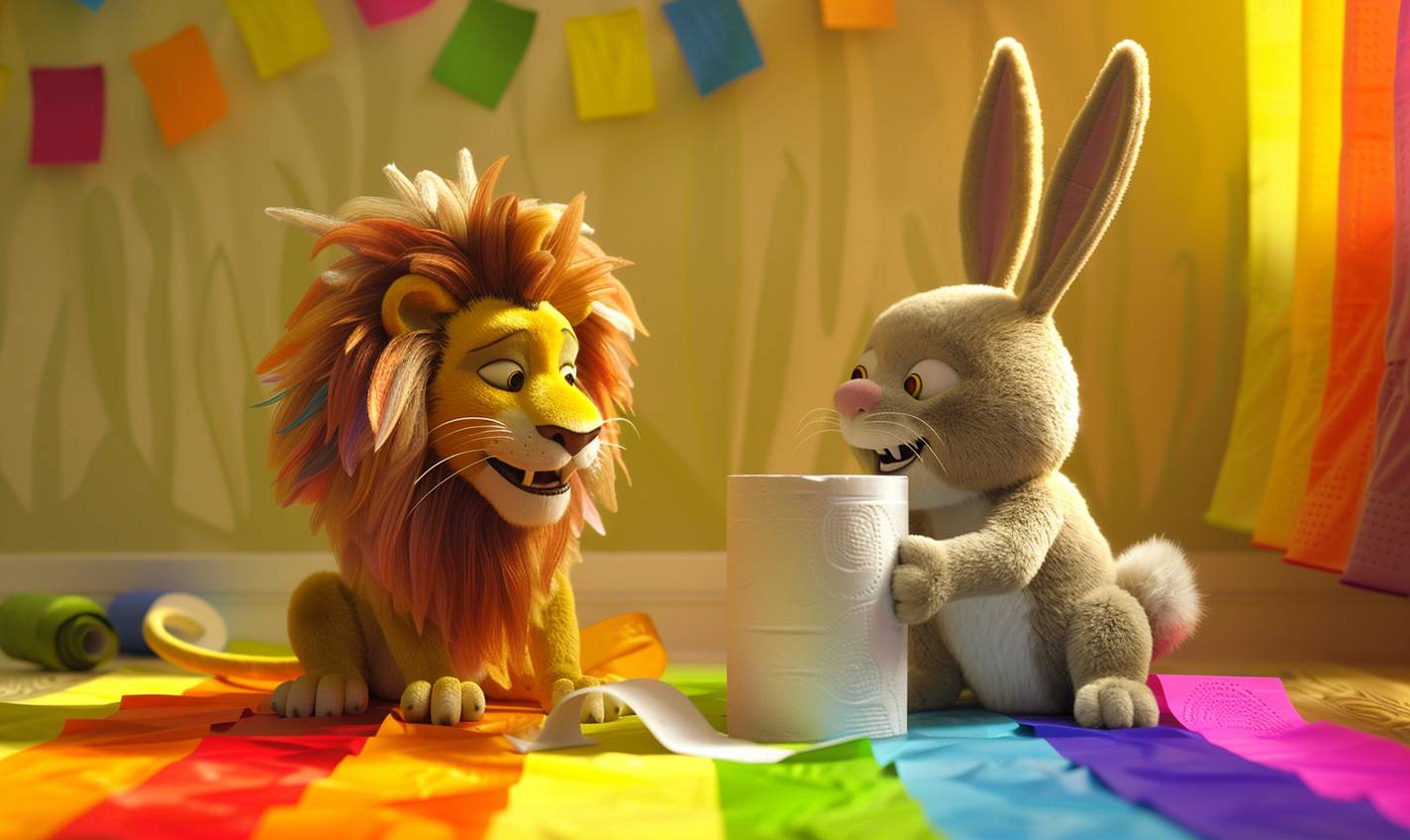 ライオンとバニーが虹色のトイレットペーパーで遊んでいます!
