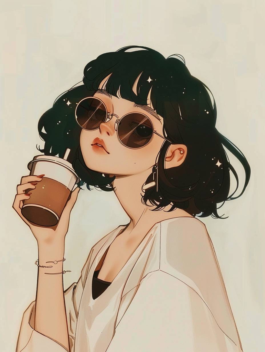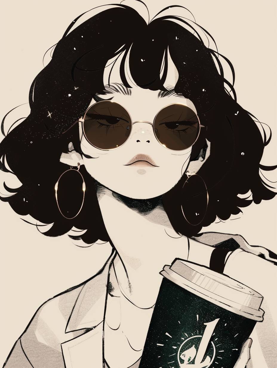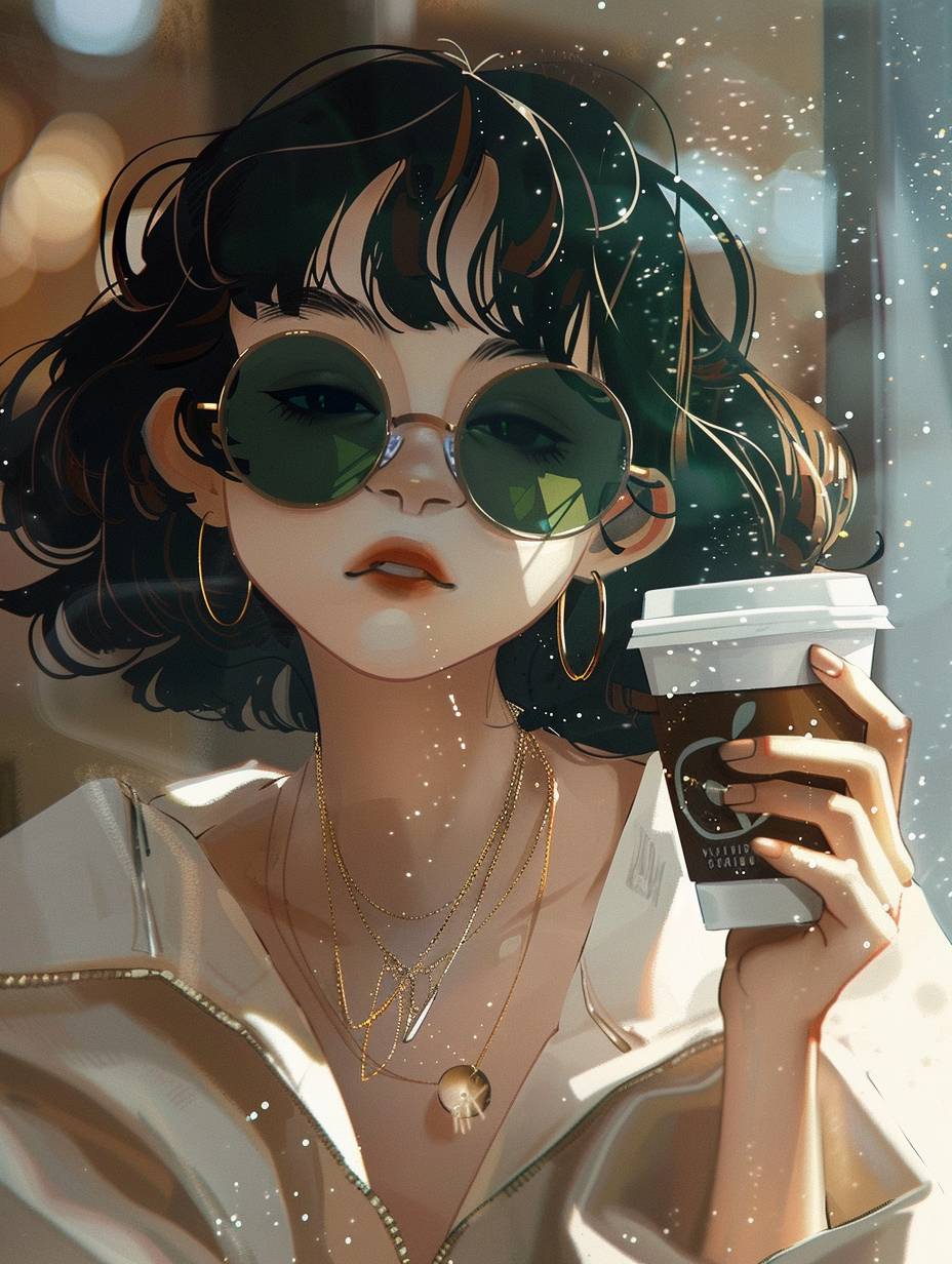 Cool girl, wearing sunglasses, drinking coffee, looking very cool and dragging --ar 3:4 --cref <https://s.mj.run/cevhkcyY1cY> --cw 100 --v 6.0