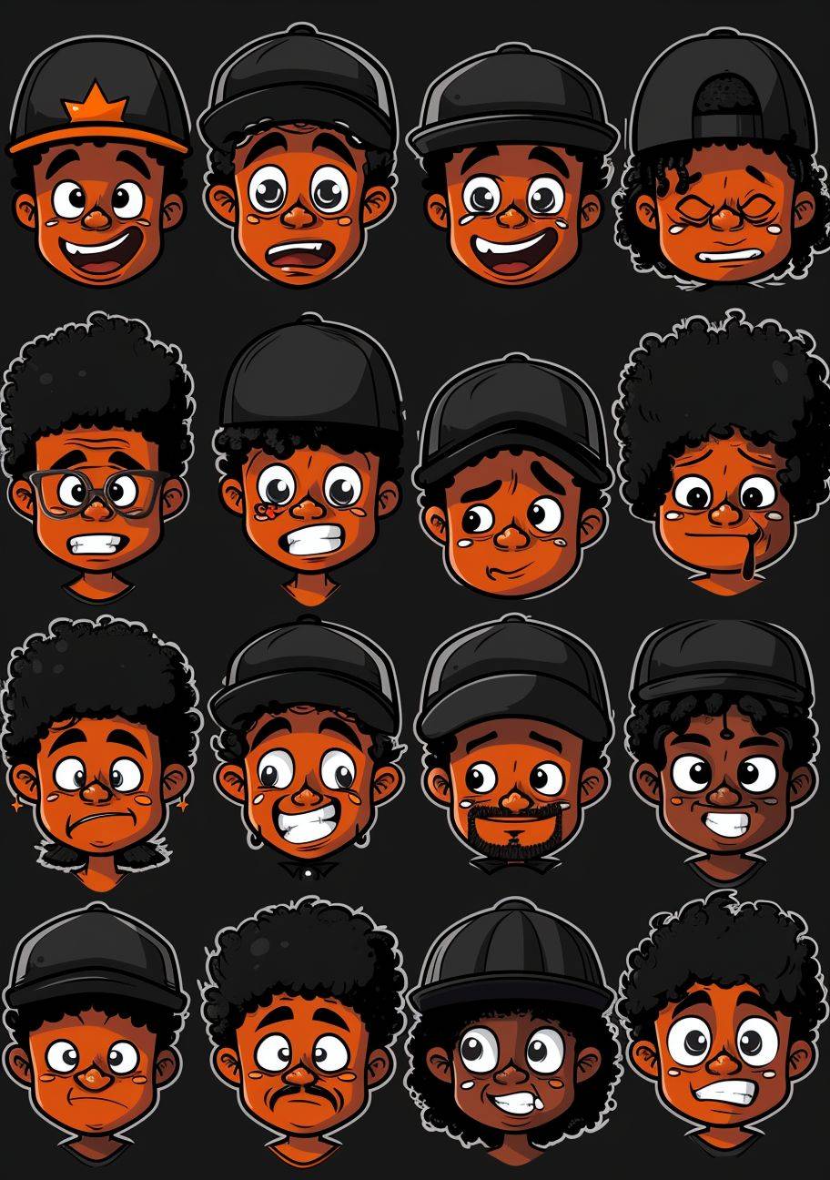 黒いランダムな感情黒色アフロの絵文字、ヒップホップハット付き、1. 😊 幸せ 2. 😄 喜び 3. 😃 興奮 4. 😁 にっこり 5. 😂 笑っている 6. 😢 悲しい 7. 😭 泣いている 8. 😞 がっかり 9. 😠 怒り 10. 😡 フラストレーション 11. 😐 ニュートラル 12. 😕 混乱 13. 😟 心配 14. 😨 不安 15. 😱 怖い 16. 😴 眠い 17. 😪 疲れている 18. 😌 救済 19. 😎 クール 20. 😇 天使、エッジの効いたキャリカチュアスタイル、ロイッシュ、写真のような詳細なポートレート、太いライン、黒の黒、アンドレイ・マルキン、非常に詳細なフィギュア、キッドパンク、黒い背景。