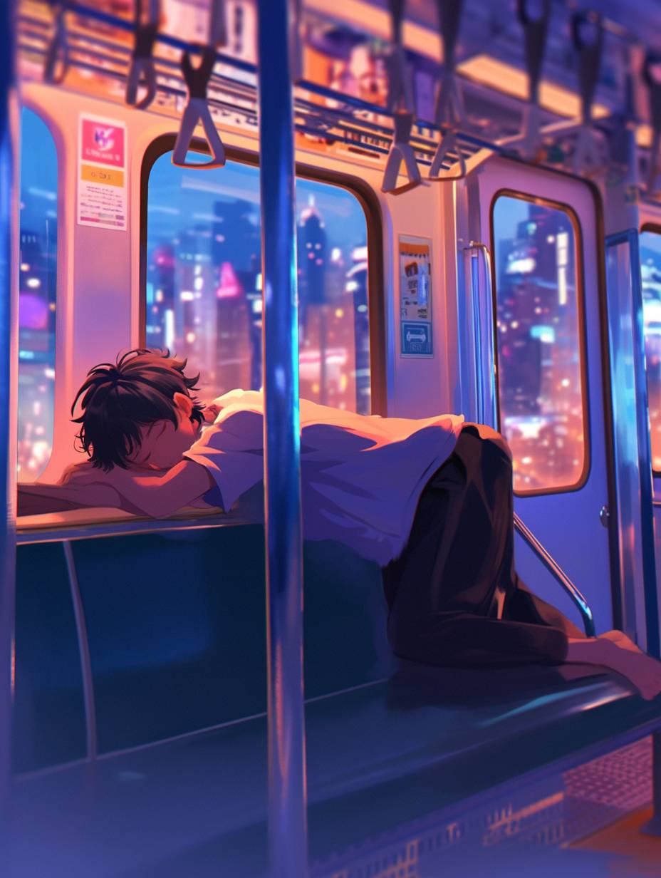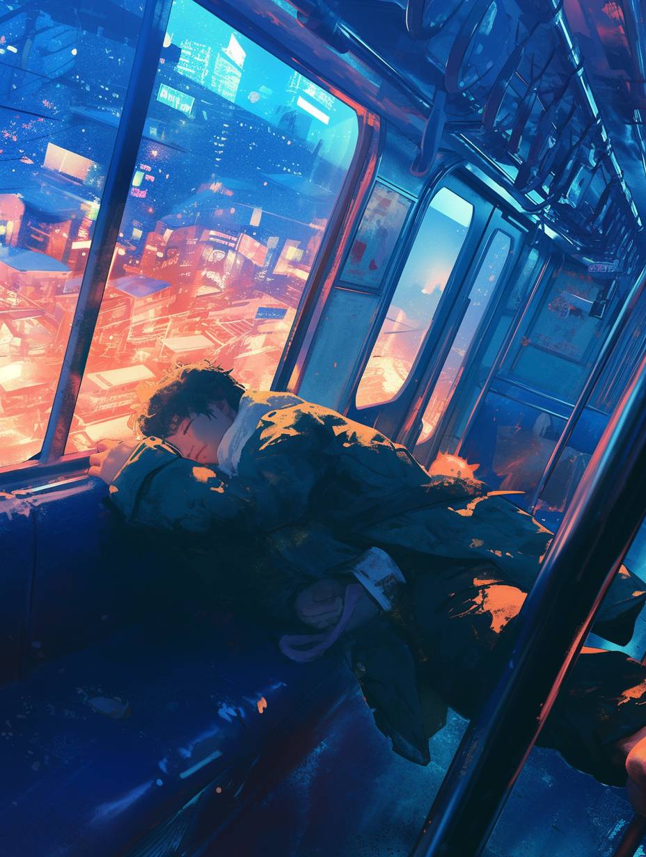 夜、男の子が地下鉄で寝ていて、外は都市の夜景。