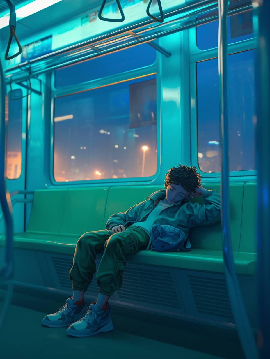 夜に、少年は仕事を終えたばかりで、地下鉄に乗っているときに手すりにもたれて眠り込んでしまいました。彼は車両の中で唯一の乗客で、窓の外には都市の夜景が広がっており、シンプルな風景です。高解像度で明るい色合い、詳細が豊富で、高品質です。