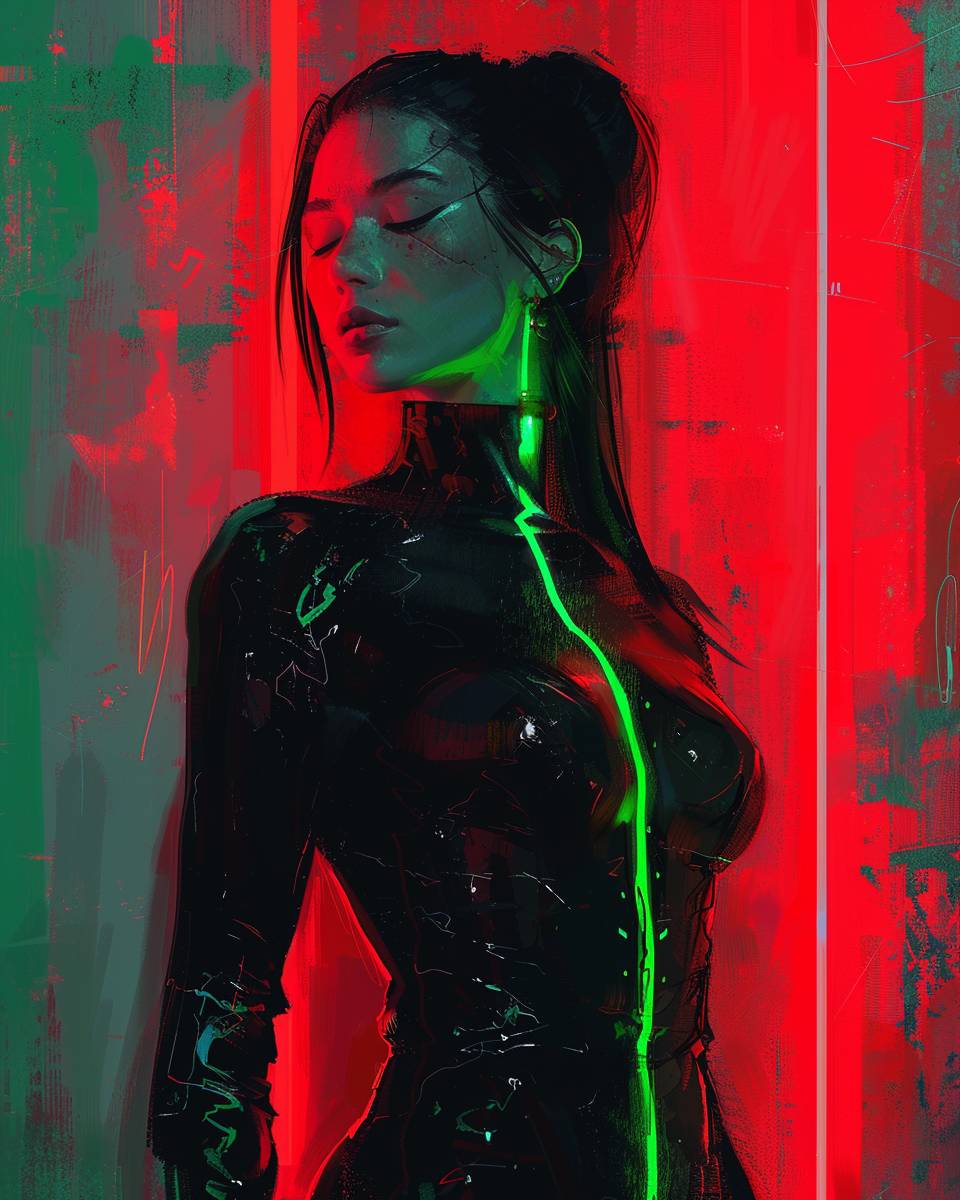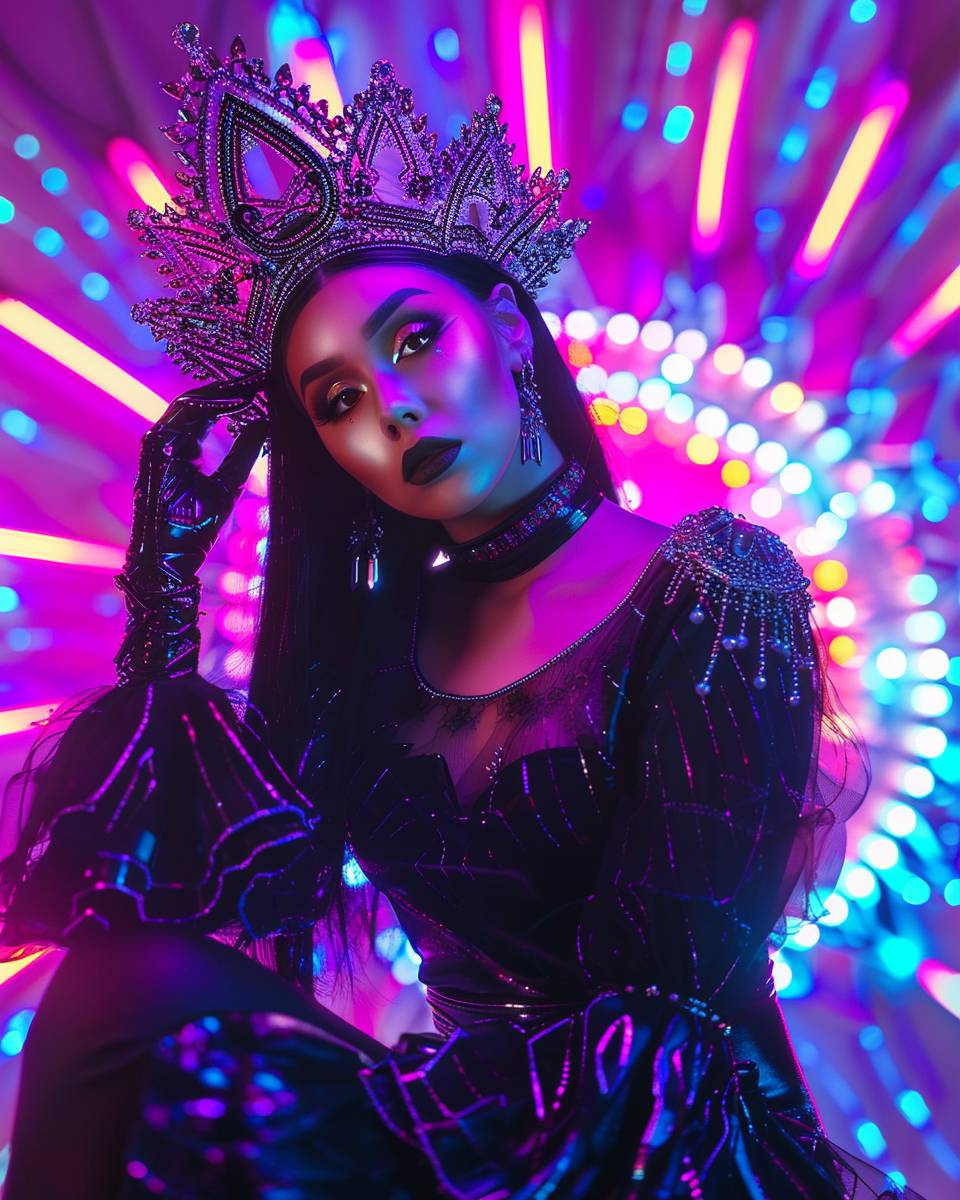 stunning cyberpunk witch, crown on head, neon lights, mature lady, hourglass figure, gorgeous black hair, fair skin, sleeveless latex outfit, tall height::1 4, dynamic posture, forced perspective, full body on canvas::1 --style raw --ar 4:5 --v 6.0