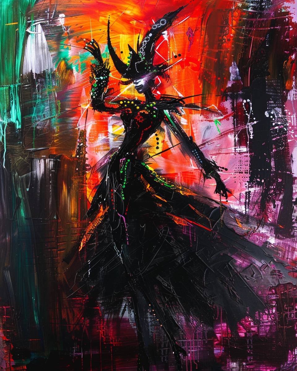 驚くべきサイバーパンクの魔女、頭に冠、ネオンの光、成熟した女性、砂時計のような体型、美しい黒髪、公正な肌、袖のないラテックスの衣装、高身長、ダイナミックなポーズ、強制的な視点、キャンバス上の全身。