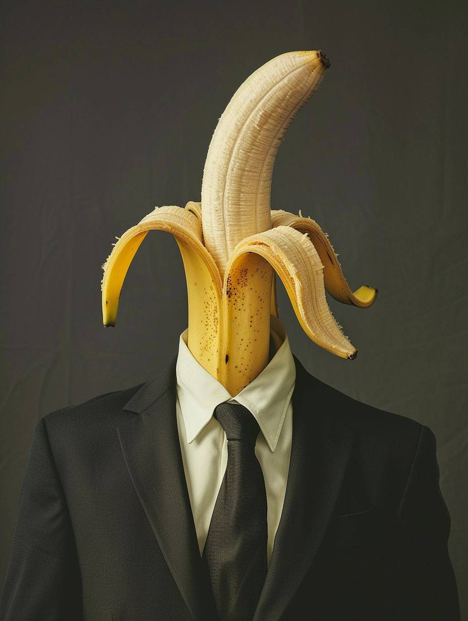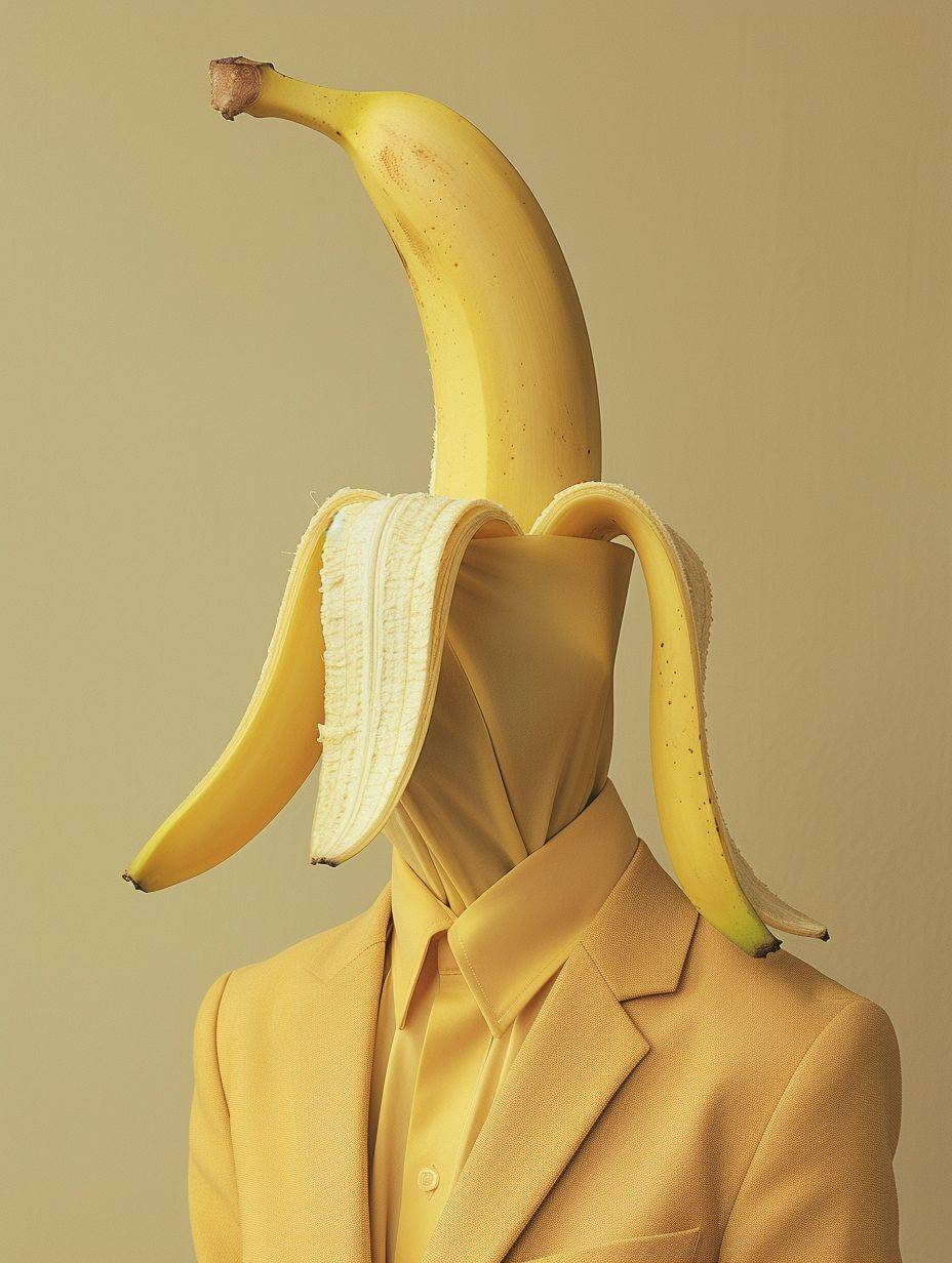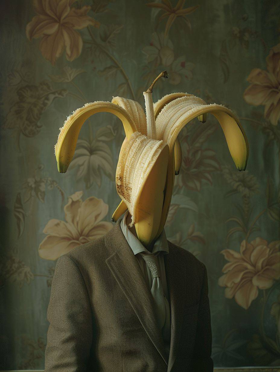 これは、頭が開いたバナナの男性を描いた超現実的な写真作品で、独特なスタイルです。