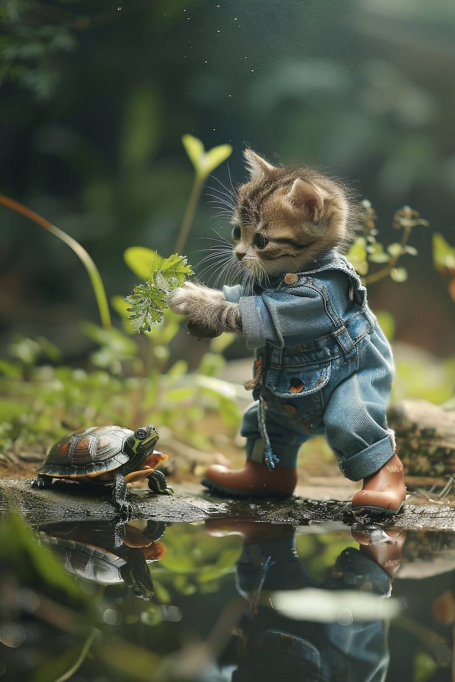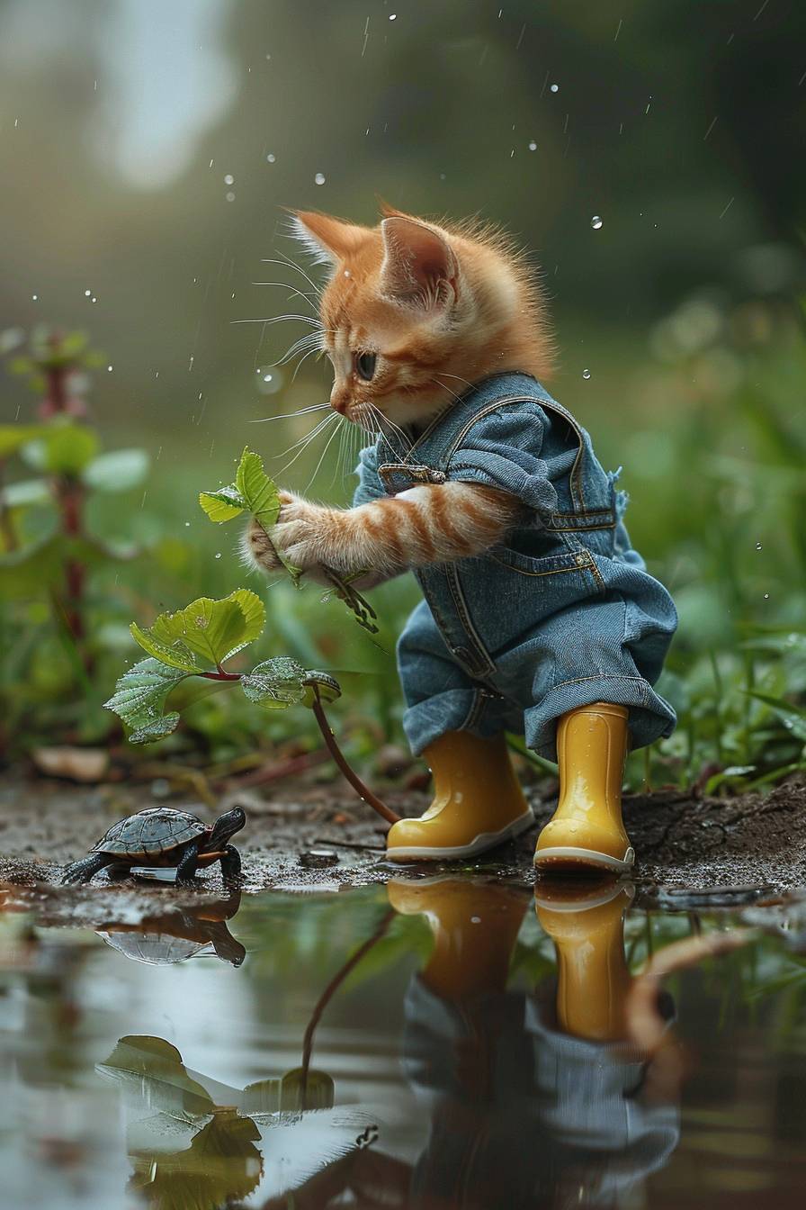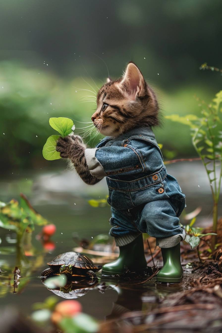 a photo of a realistic kitten that wears a cute denim overall and rain boots is kneeling down and feeding a vegetable leaf to a turtle next to a pond in a park. --ar 2:3 --v 6.0