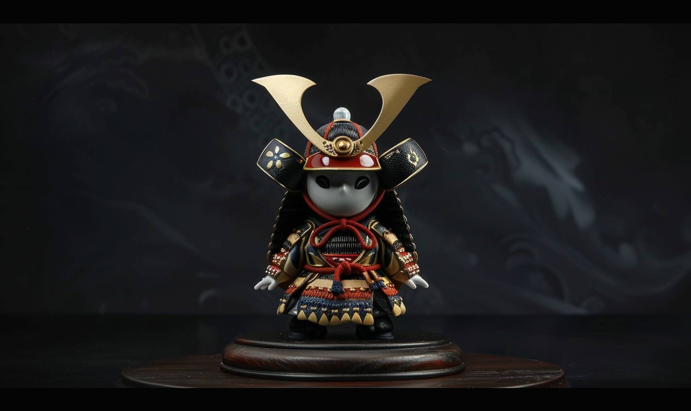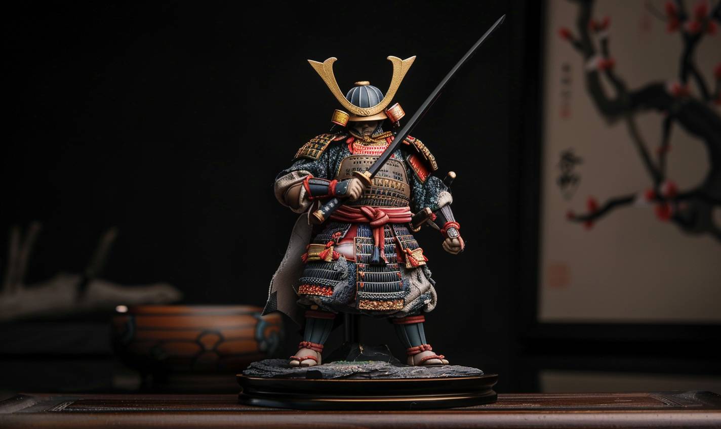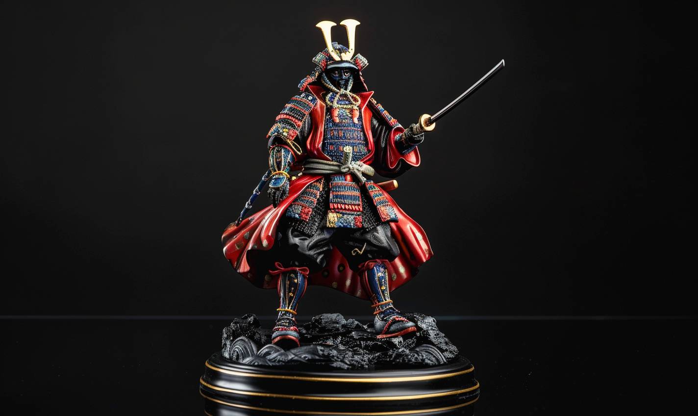 samurai figurine designed and painted by Liu Ye on black background --stylize 75 --v 6.0 --ar 5:3