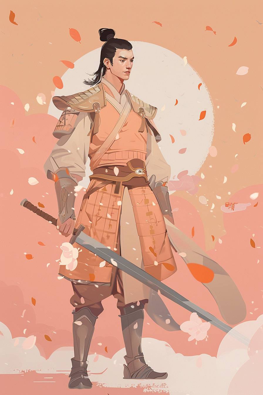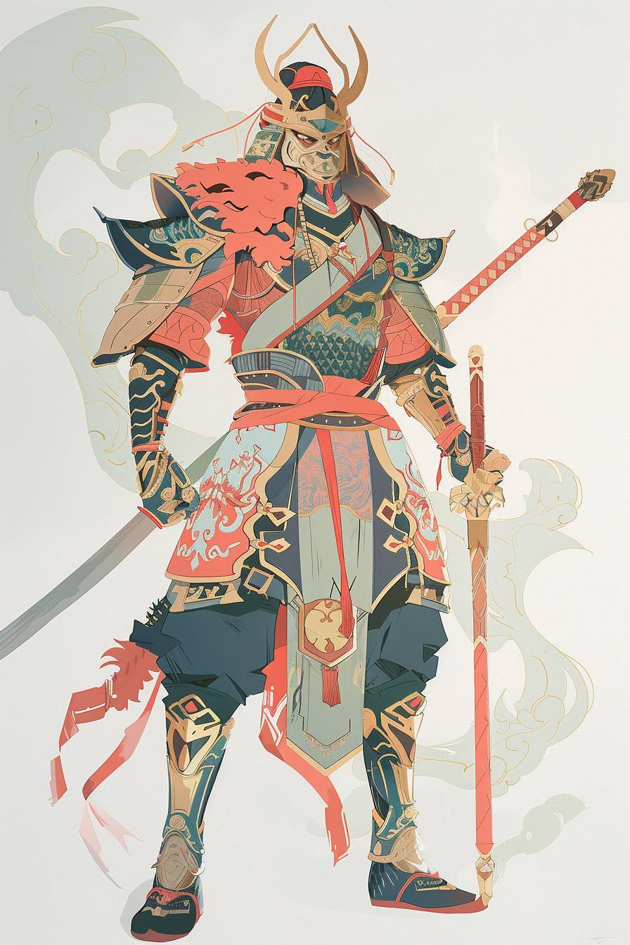 Hsiao Ron Chengのスタイルで、戦士キャラクターの全身、フラットカラーのイラスト