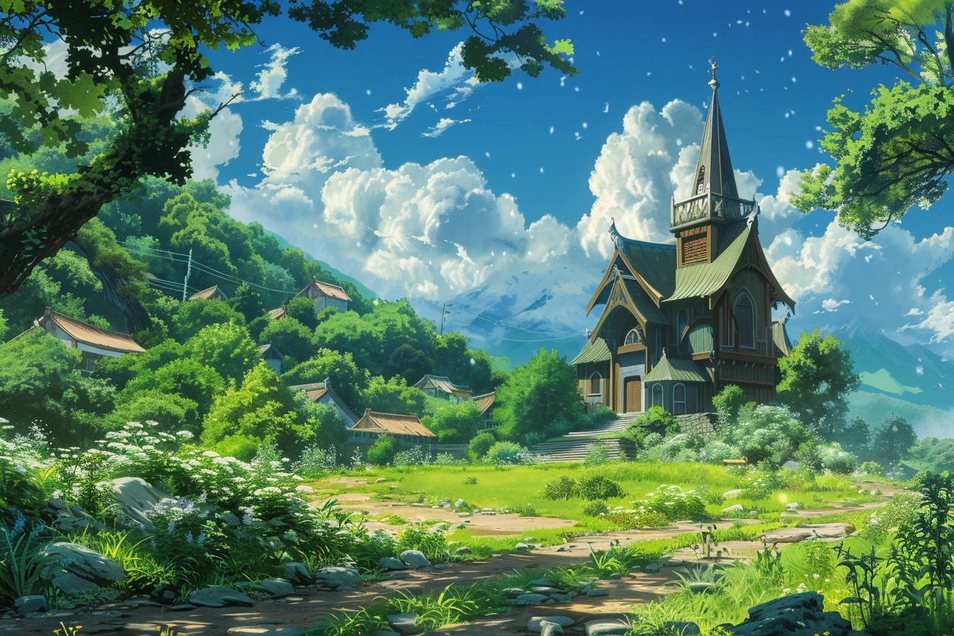 尾田栄一郎スタイルの素晴らしい自然の風景、教会