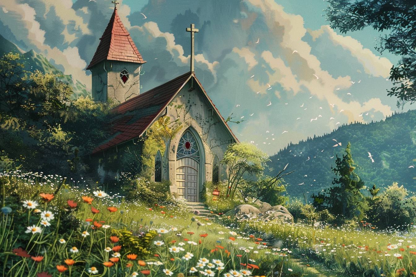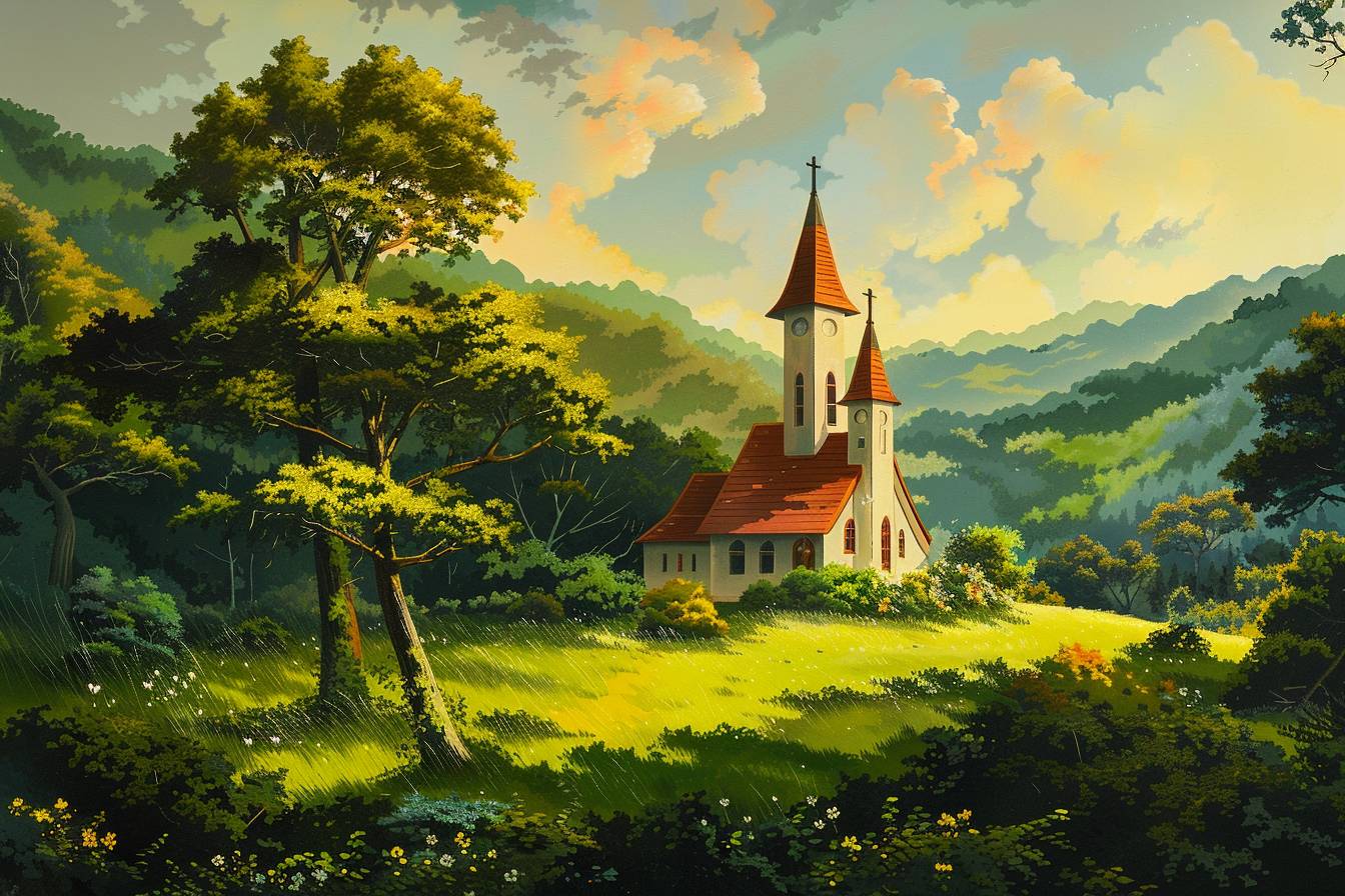 in style of Eiichiro Oda, stunning natural landscape, church --ar 3:2 --v 6.0