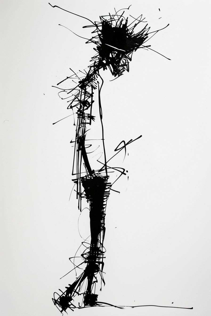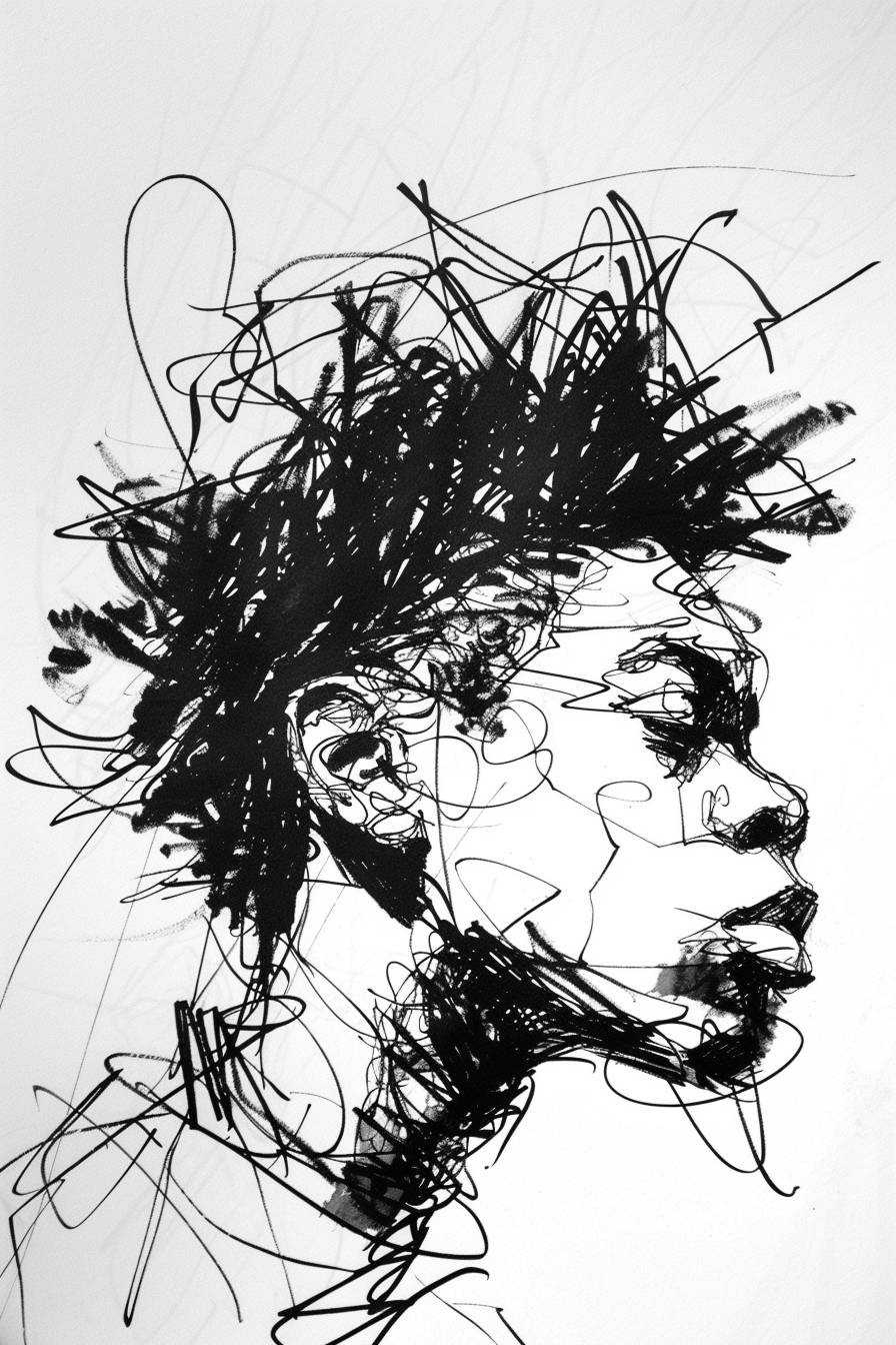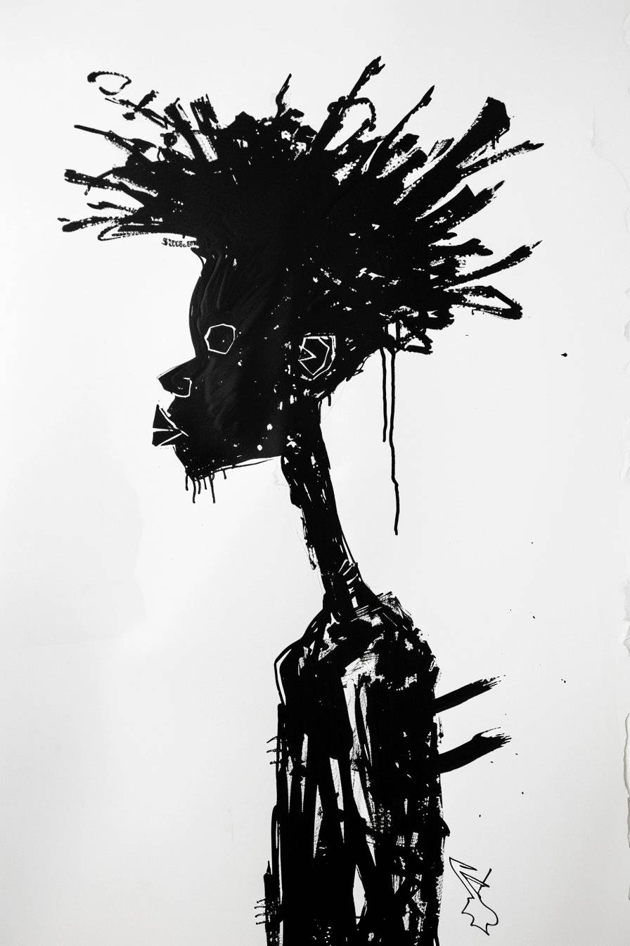 ジャン=ミシェル・バスキア風、キャラクター、インクアート、側面ビュー