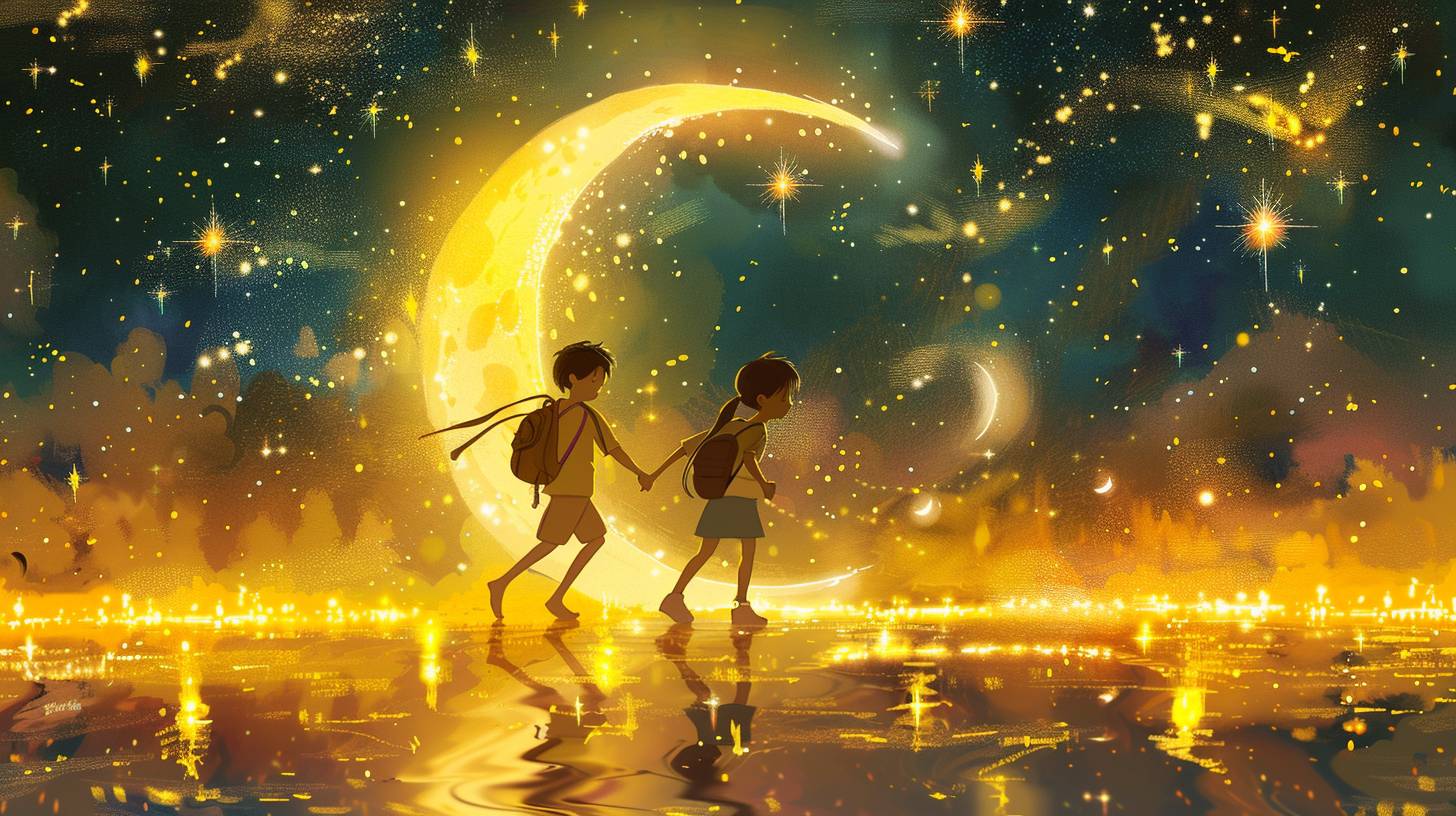 A boy and girl running hand in hand, carrying backpacks, under the crescent moon with stars shining brightly behind them. The background is an illustration of a yellow night sky. They appear to be enjoying each other's company as they walk towards the horizon. --ar 16:9 --v 6.0