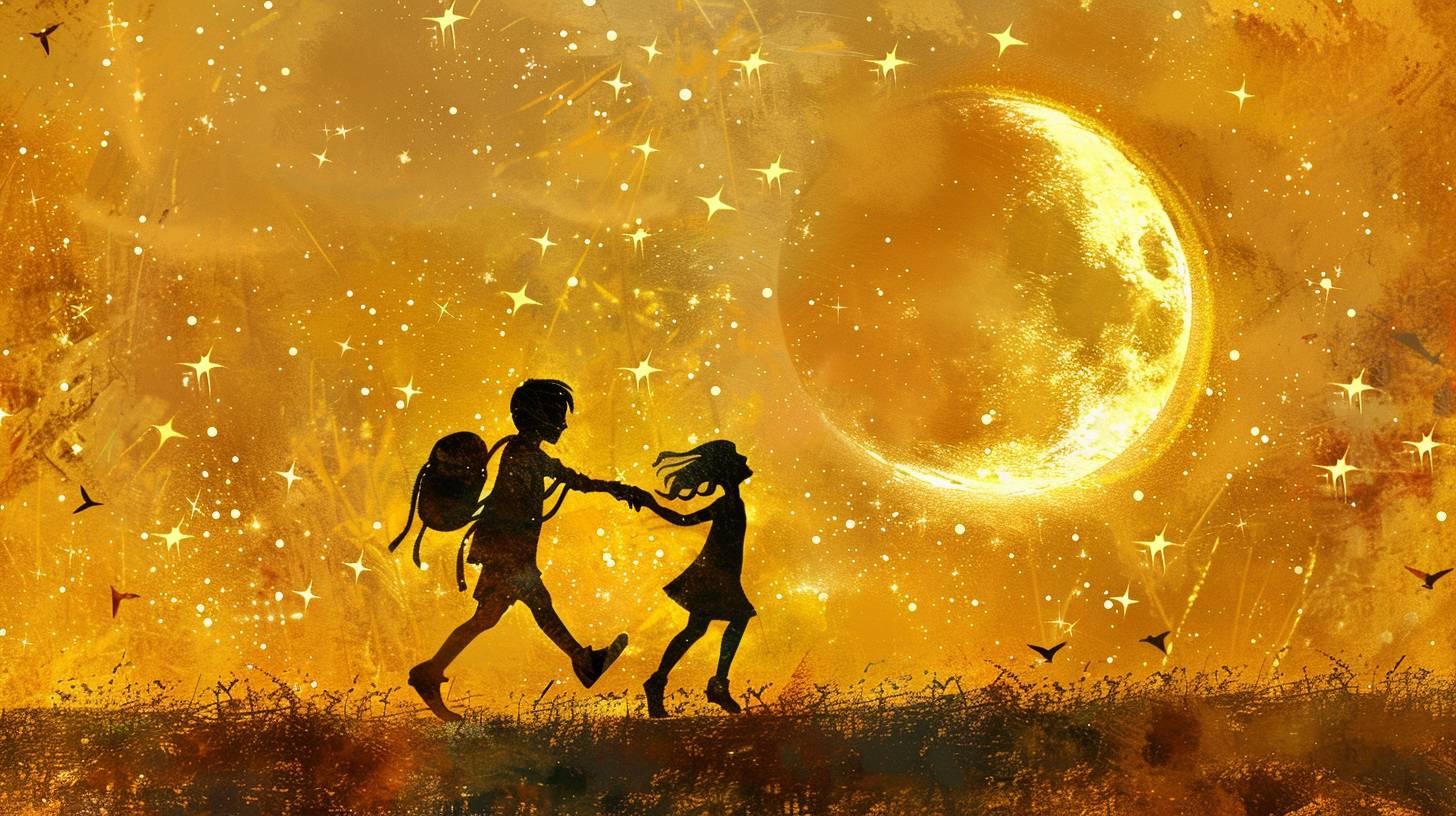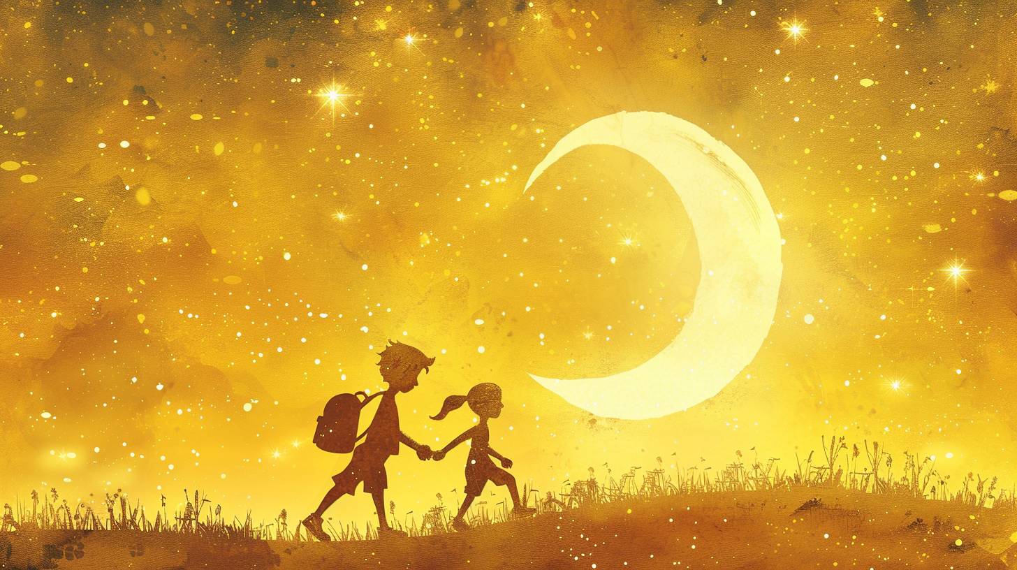 男の子と女の子が手をつないで走り、リュックを背負い、新月の下で星が明るく輝いています。背景は黄色い夜空のイラストです。彼らは地平線に向かって歩きながら、お互いの時間を楽しんでいるように見えます。