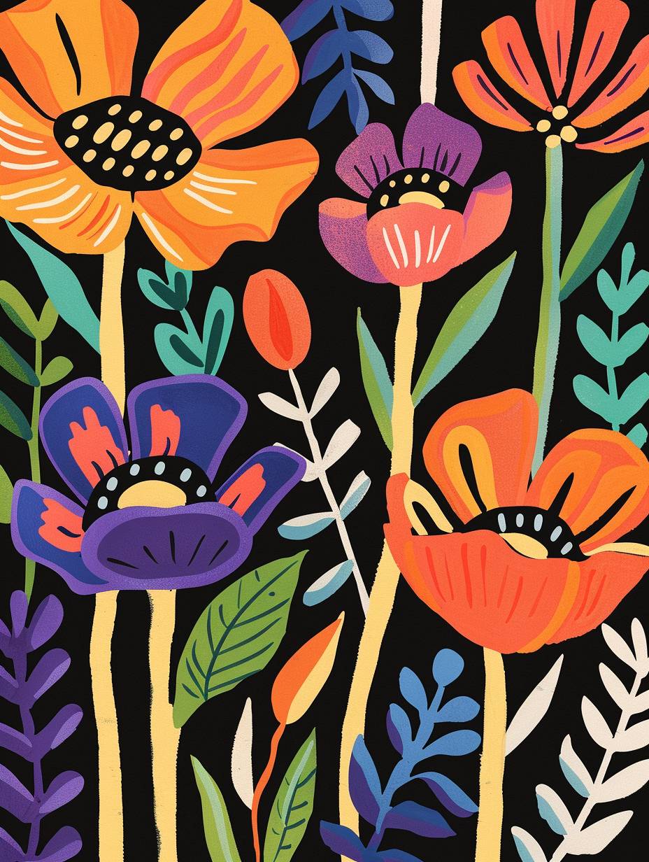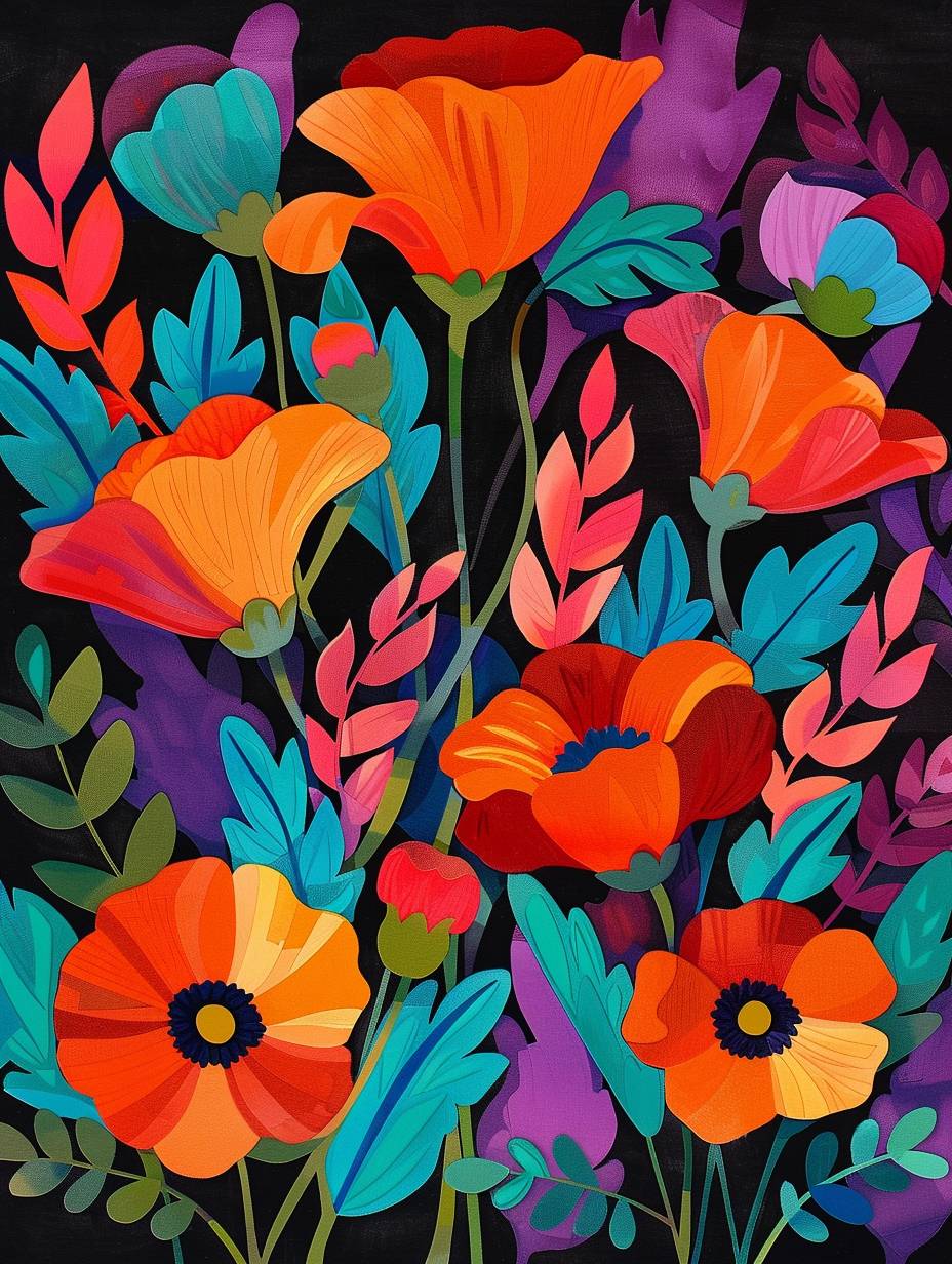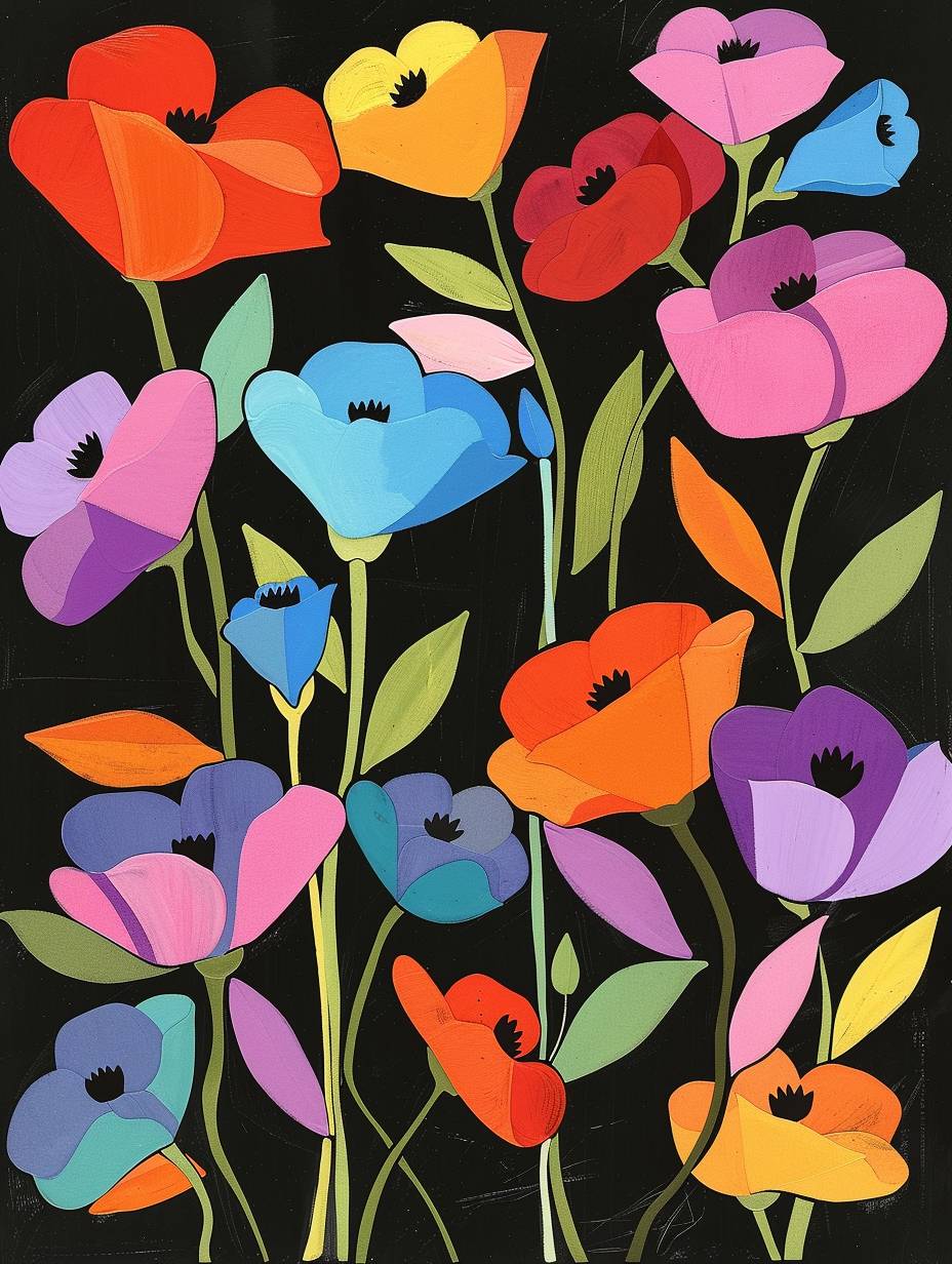 マティスの切り抜きポピー、Garry McCoyスタイルで、フォークアートにインスパイアされたラインアートイラスト、民俗イラスト、手描きの要素、フラットなカラーブロック、水彩とインクの絵画、カラフルな木版画、黒い背景、オレンジ、ピンク、紫、青、緑、黄色。