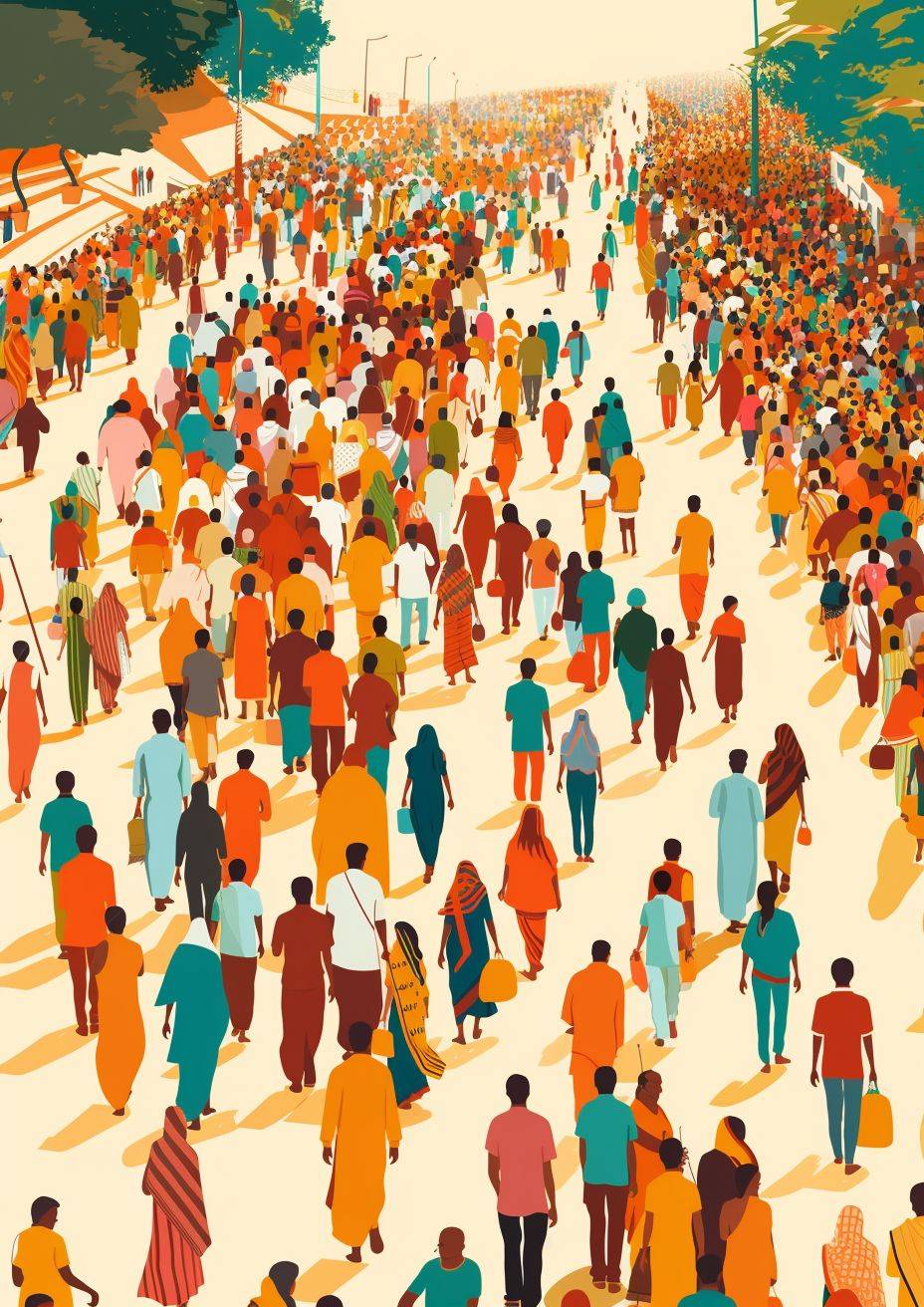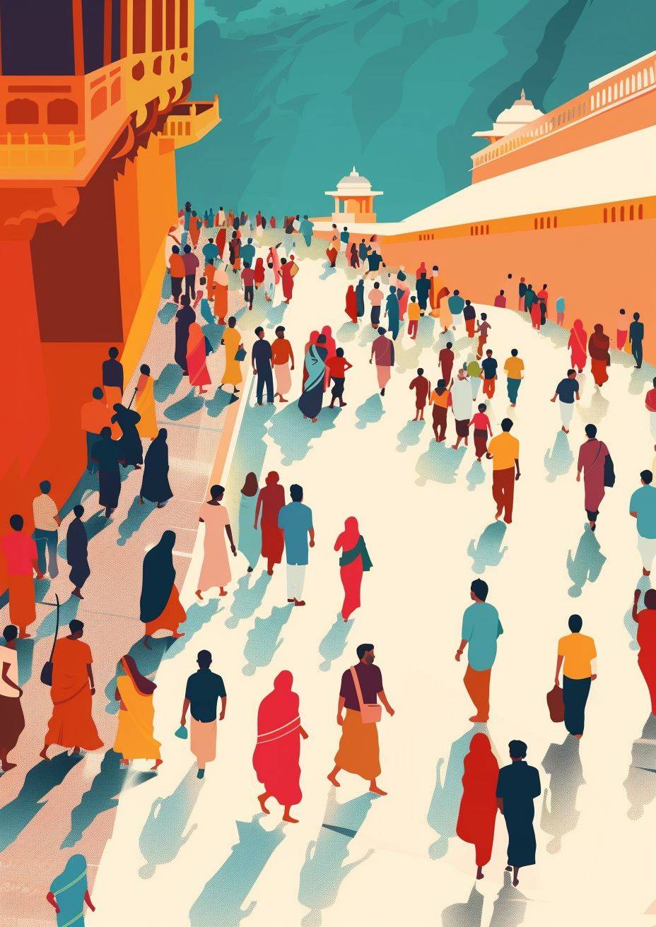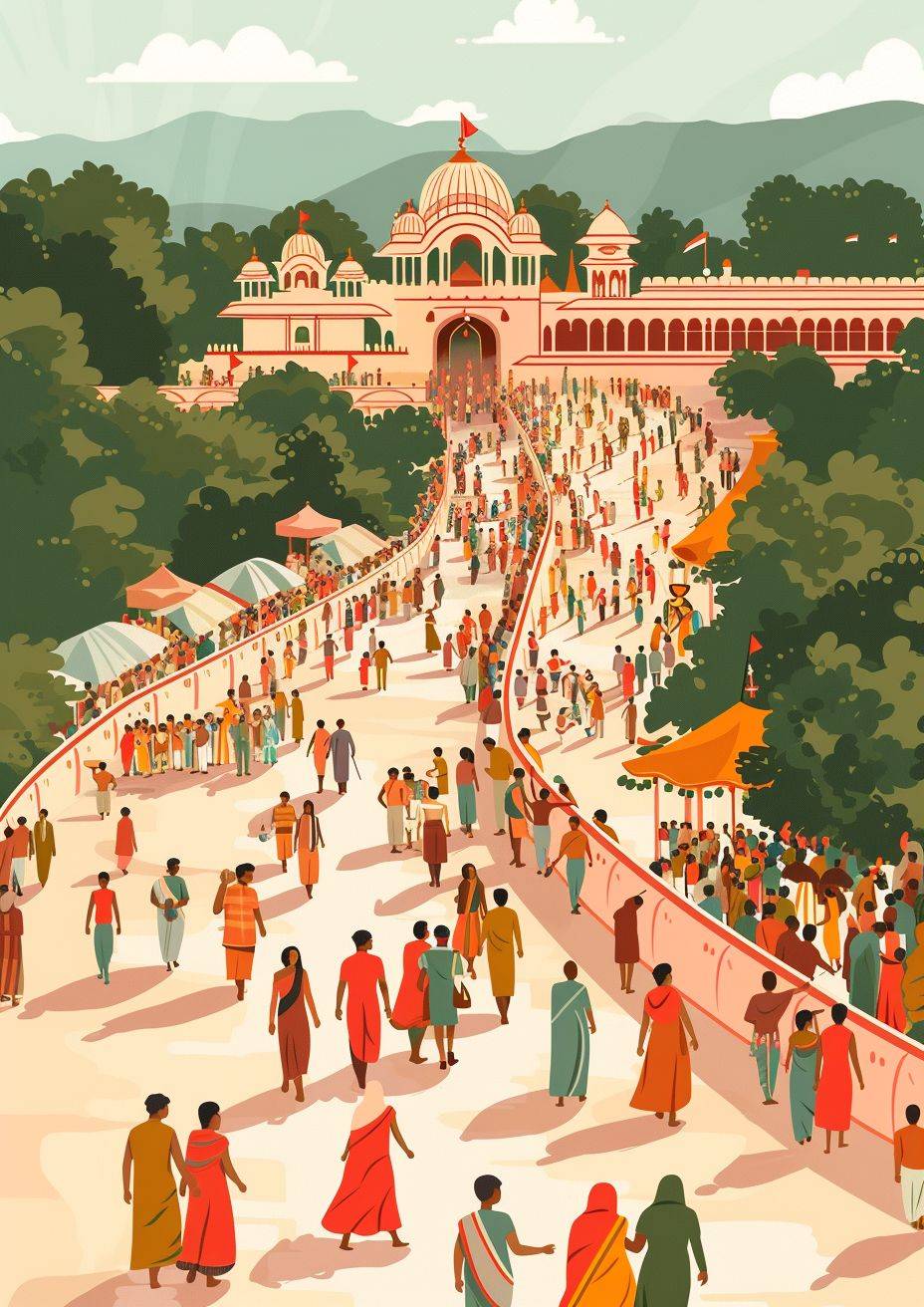 インドのプリー・ラト・ヤータの現代的なフラットデザインのイラスト、人物が描かれ、壮大な構図で、シンプルなスタイル。