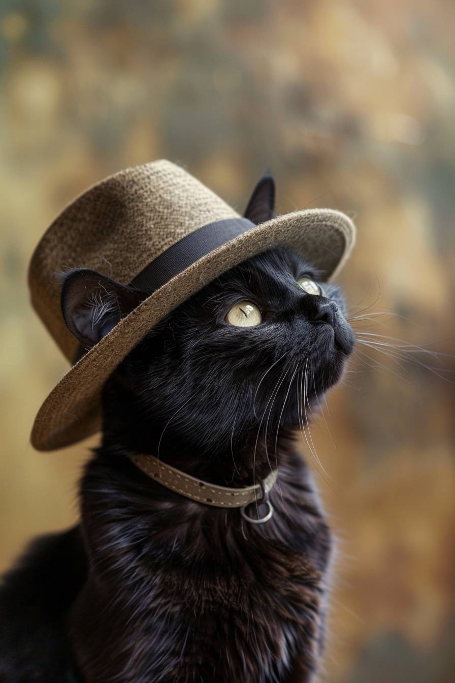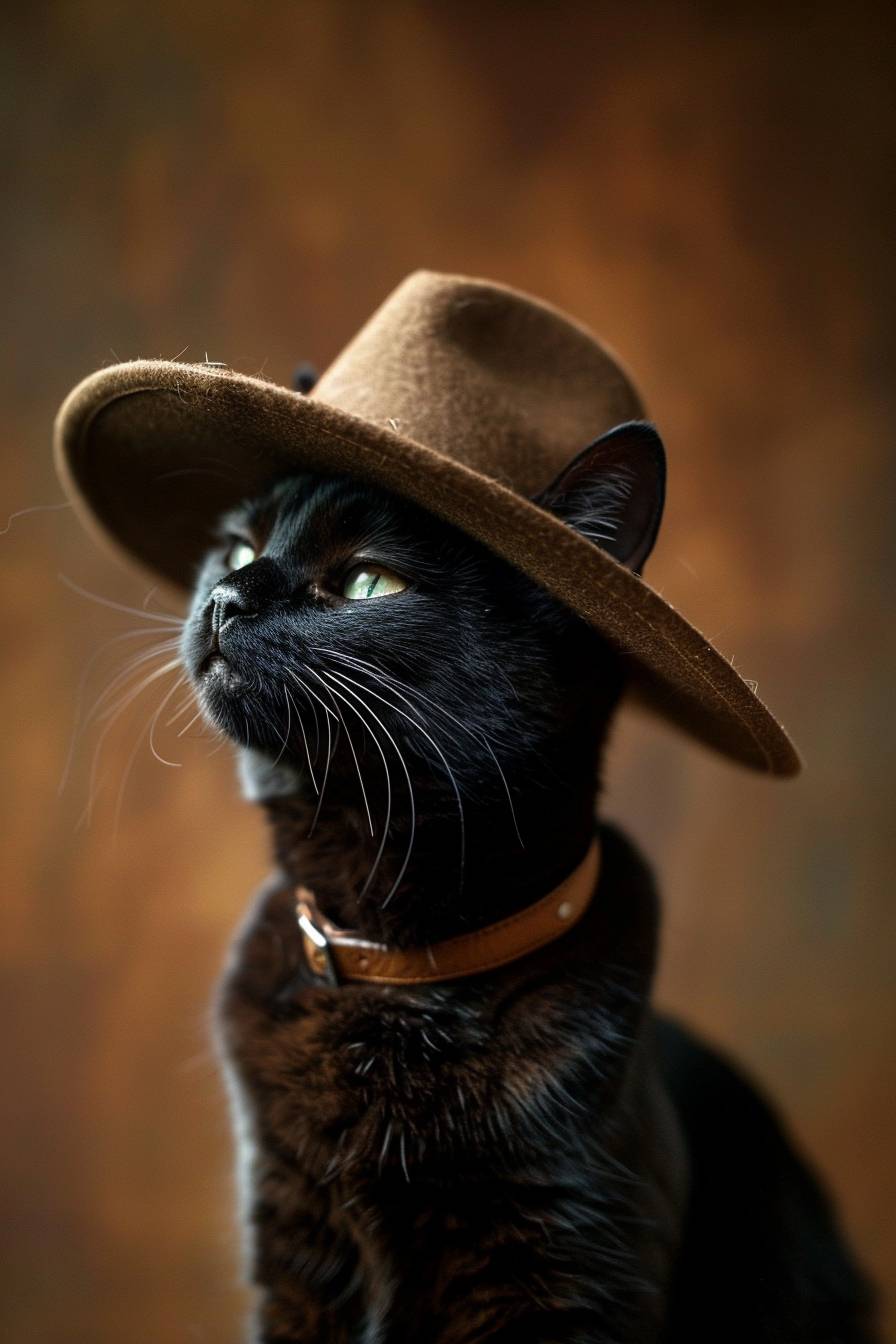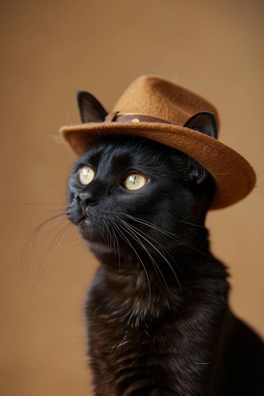 A skinny, short-haired, slender black cat, proudly wearing a wide-brimmed brown fedora hat, dreaming of being an archaeologist. Soft olive brown textured studio brackground. --ar 2:3 --style raw --v 6.0
