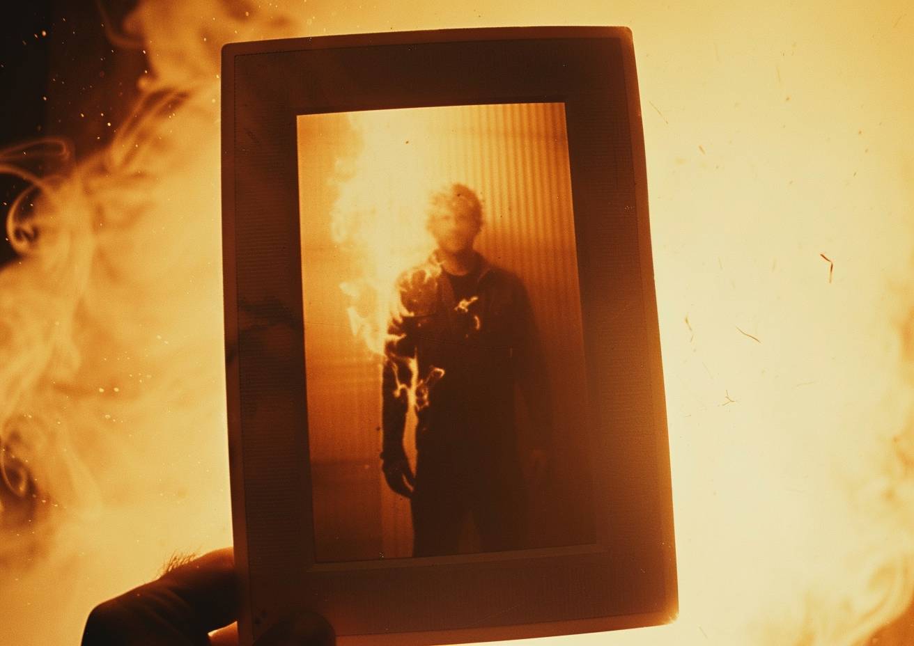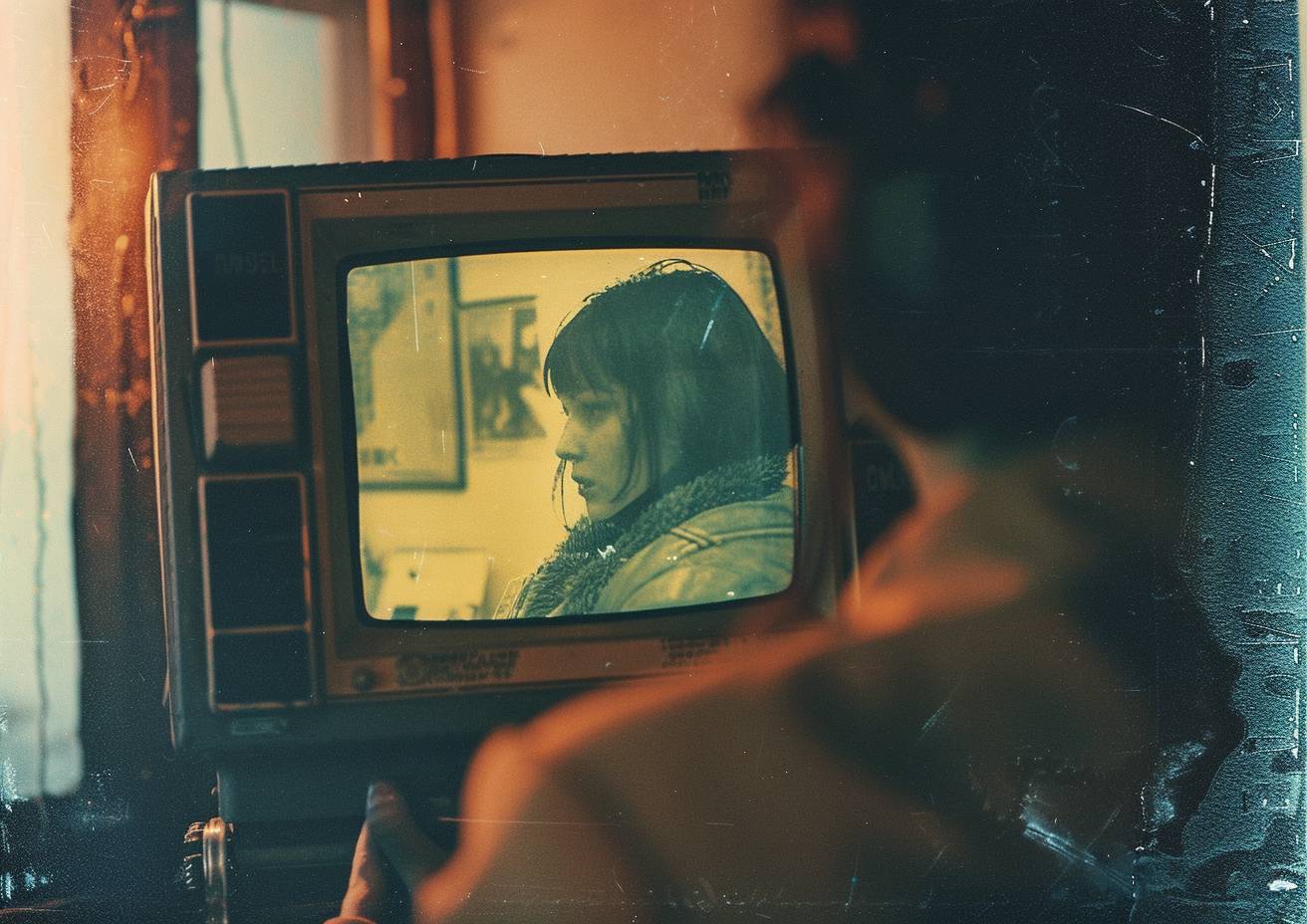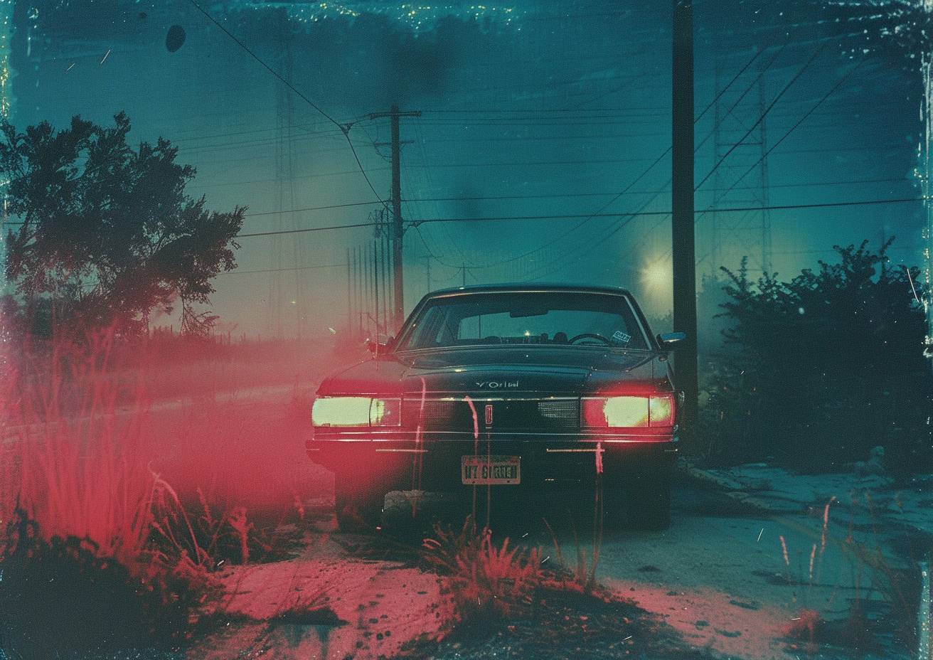 [主題]を特徴とするアイコニックな映画シーンの写真で、90年代の美学、フラッシュ写真、フィルムグレイン、超リアルなスタイルで、ポラロイドフィルム写真のスタイルを持ち、グレインフィルター効果があります。