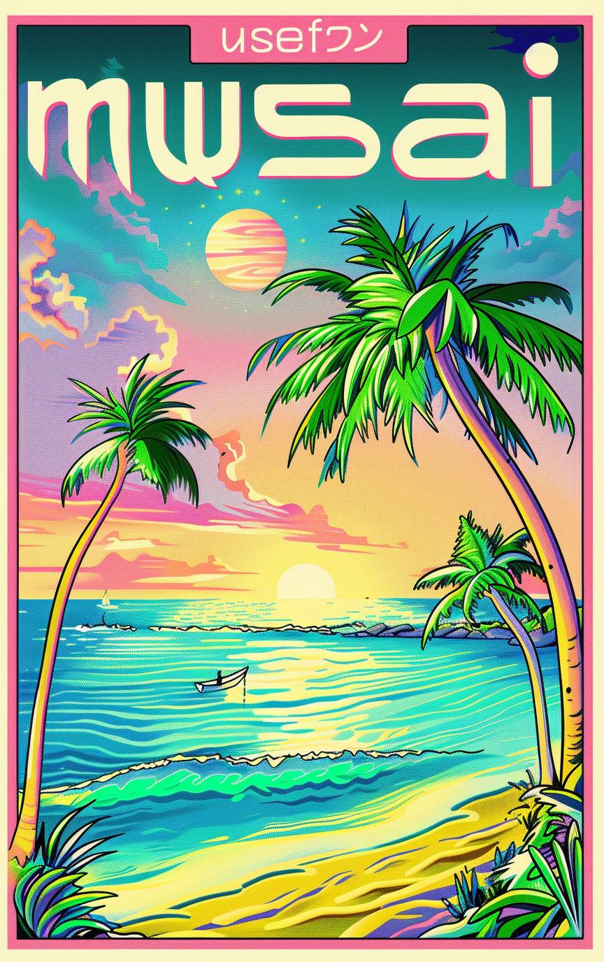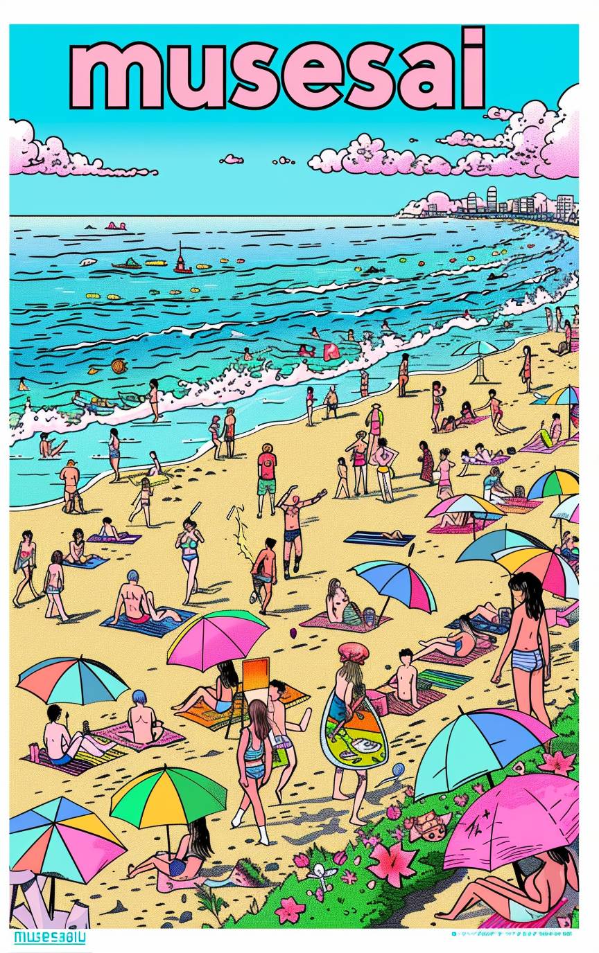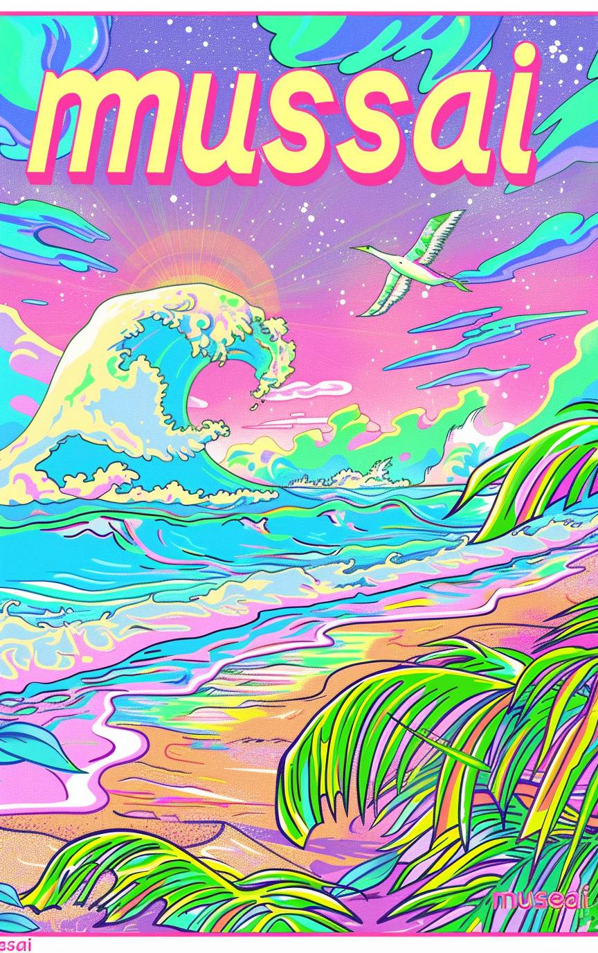 かわいいカートゥーンビーチ、カラフルな日本のポスター、背景はグラデーションの音楽メロディの波模様、「musesai」というタイトルがデザインのトップにサイケデリックな太字フォントであり、明るい白のネオンカラー、K genericsによる日本のタイポグラフィ、色とりどりのパステルパレットと緑のアクセント、Hiroshi Nagaiによるシンプルなラインアート、全てのエッジに白い境界線があり、高コントラスト。