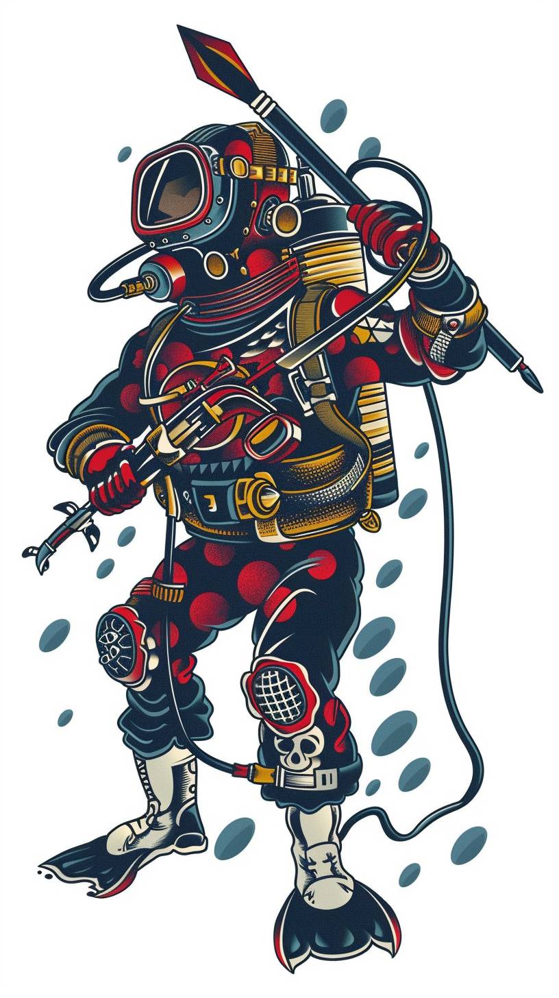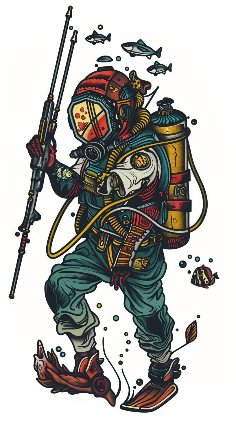 traditional tattoo scuba diver with speargun, traditional tattoo, simple, vector art, sticker, white background, --ar 9:16 --v 6.0