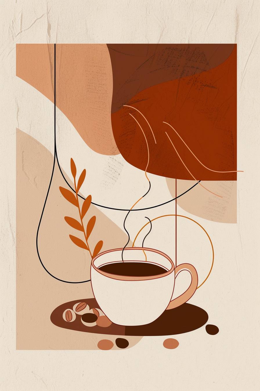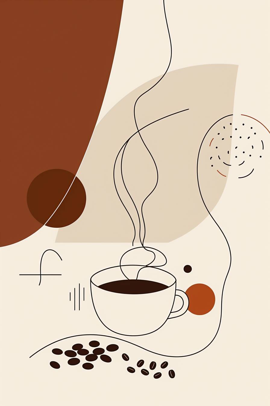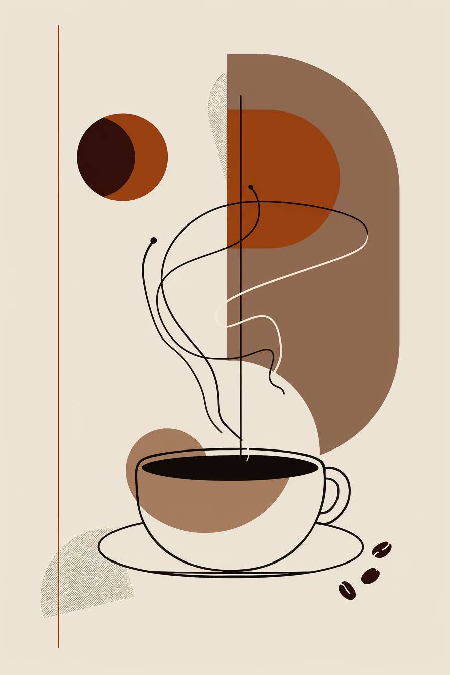 A line art poster for International Coffee Day, featuring a coffee cup, coffee beans, and steam, precise lines, geometric shapes, minimalist design. Balanced composition with modern stylish aesthetic, clean background with subtle brown and cream colors. Created Using: vector art techniques, Inkscape, Bauhaus influence, minimalist movement, thin line weights, hd quality, natural look --ar 2:3 --v 6.0