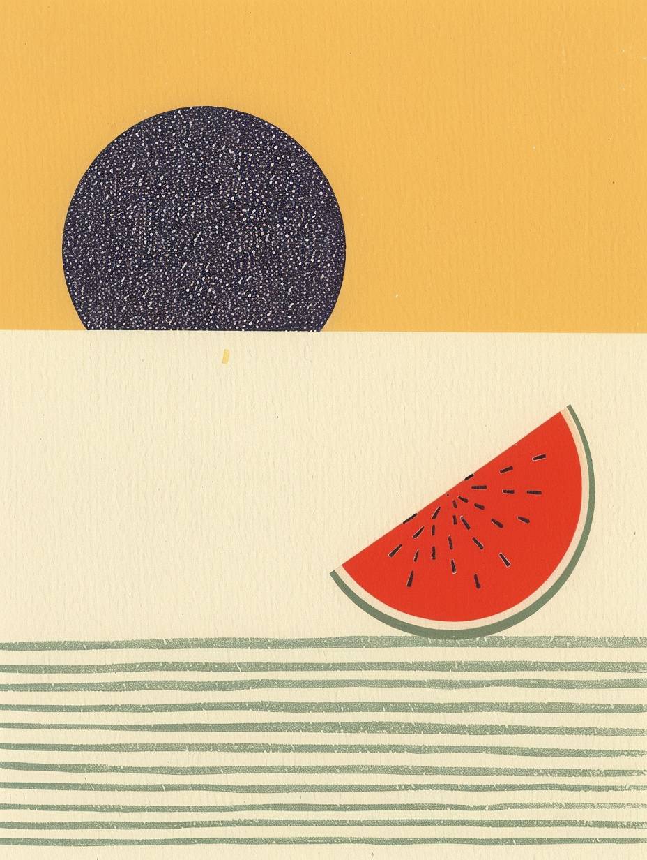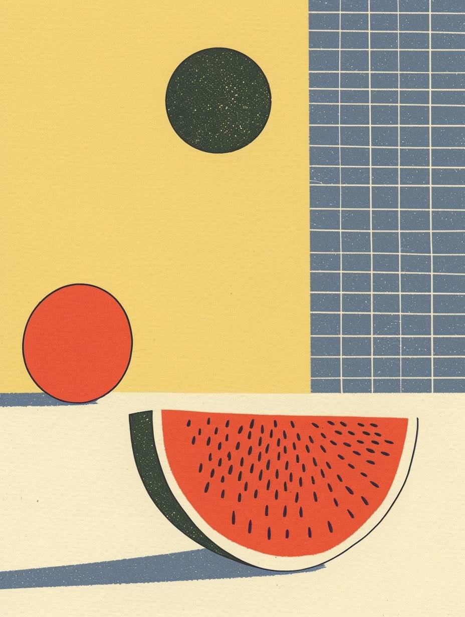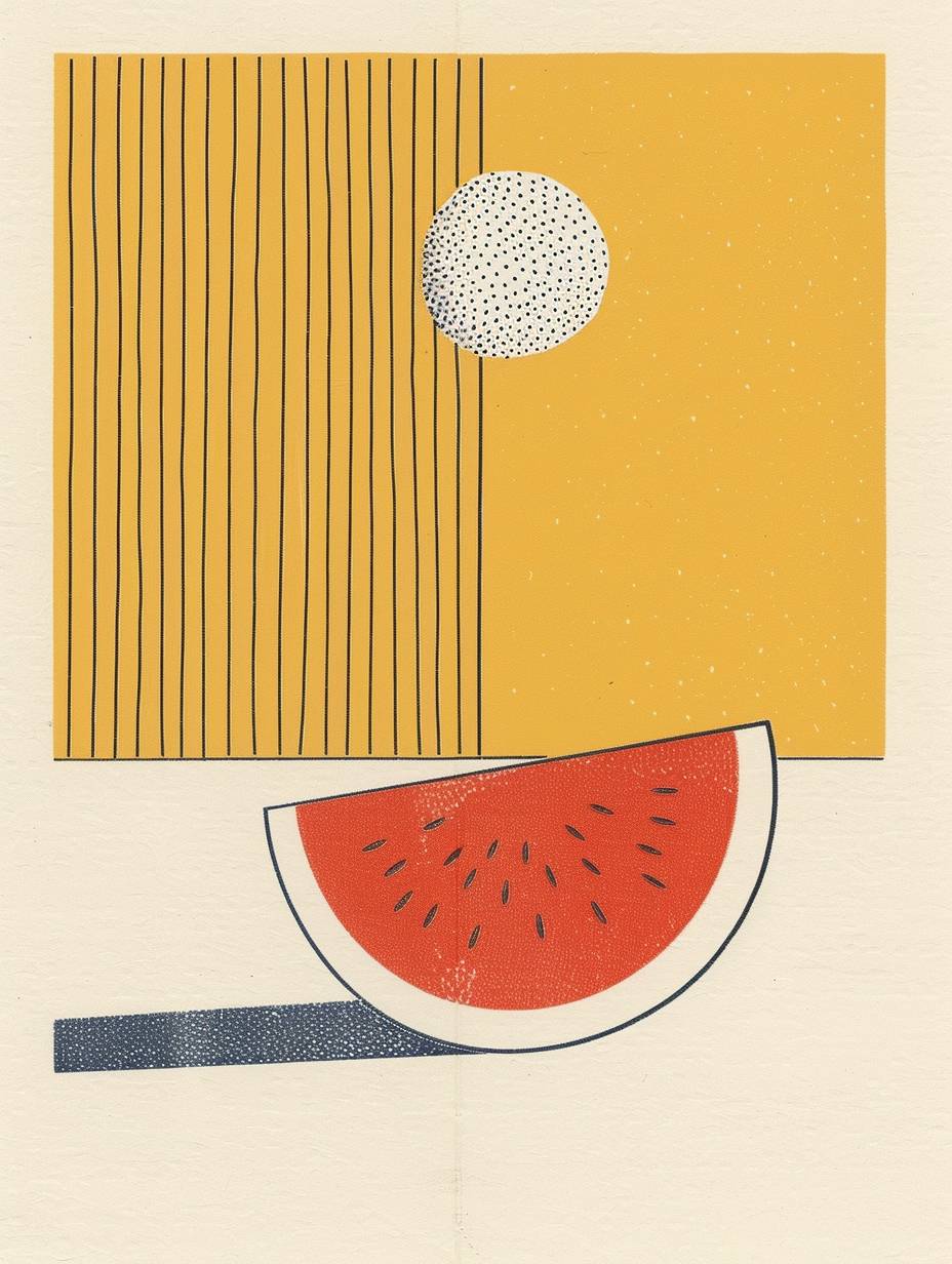 マイラ・カルマンのスタイルで描かれたスイカのスライス、かわいらしくシンプルなデザイン、黄色の背景と淡い緑のカラースキーム、素敵なパステルカラーを使いミニマリストスタイルでレトロな雰囲気を作り出しています。
