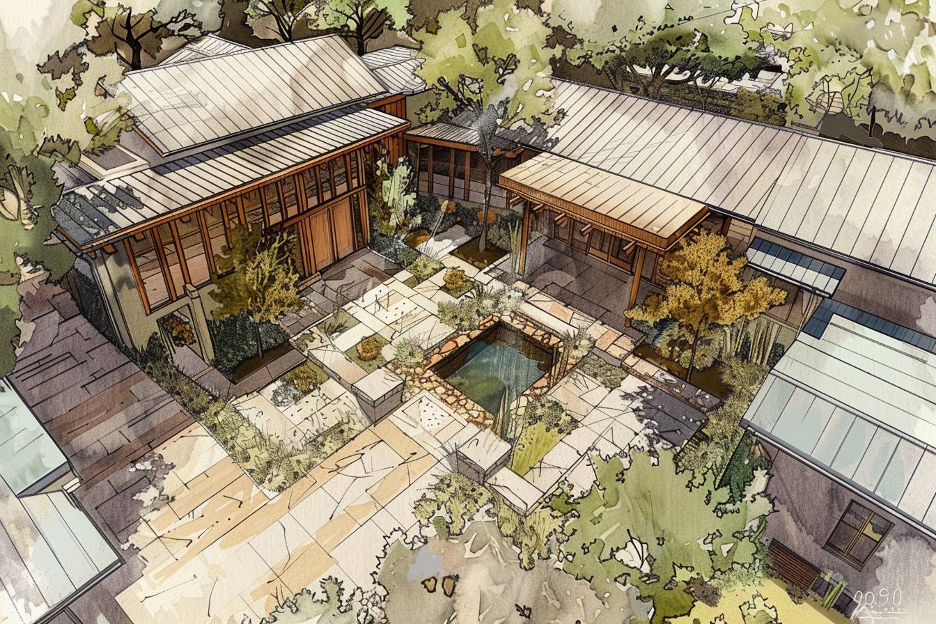 design study with multipanel breakdown of orthographic views and 3/4 views. design object is a courtyard with a very small geometric water feature. the courtyard is wrapped on three sides by a 3800 square feet sized two story house. the second story rooms should be connected. the house is modern craftsman combined with a bit of frank lloyd wright, minimalist, and industrial styles. the roof of the house is standing seam metal in a v-shape and has solar panels. materials are flagstone, stucco, steel. horizontal lines are accentuated. - midjourney user benbitdiddle --ar 3:2 --v 6.0