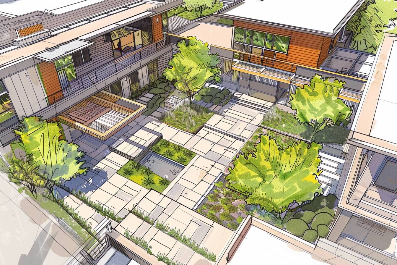 現代クラフトマンスタイルの中庭と水の特徴を設計。