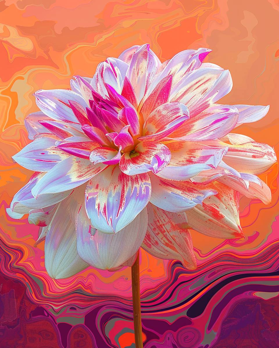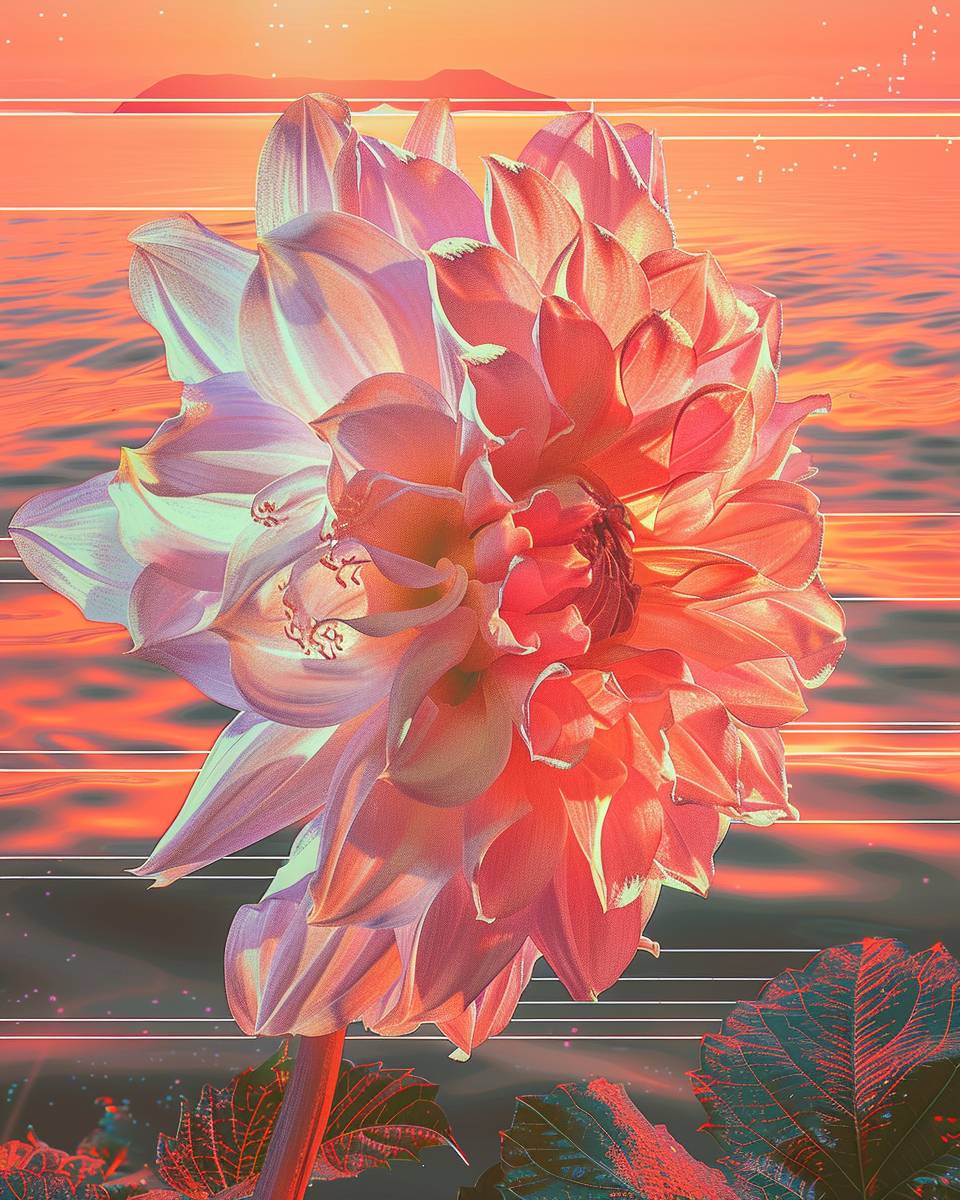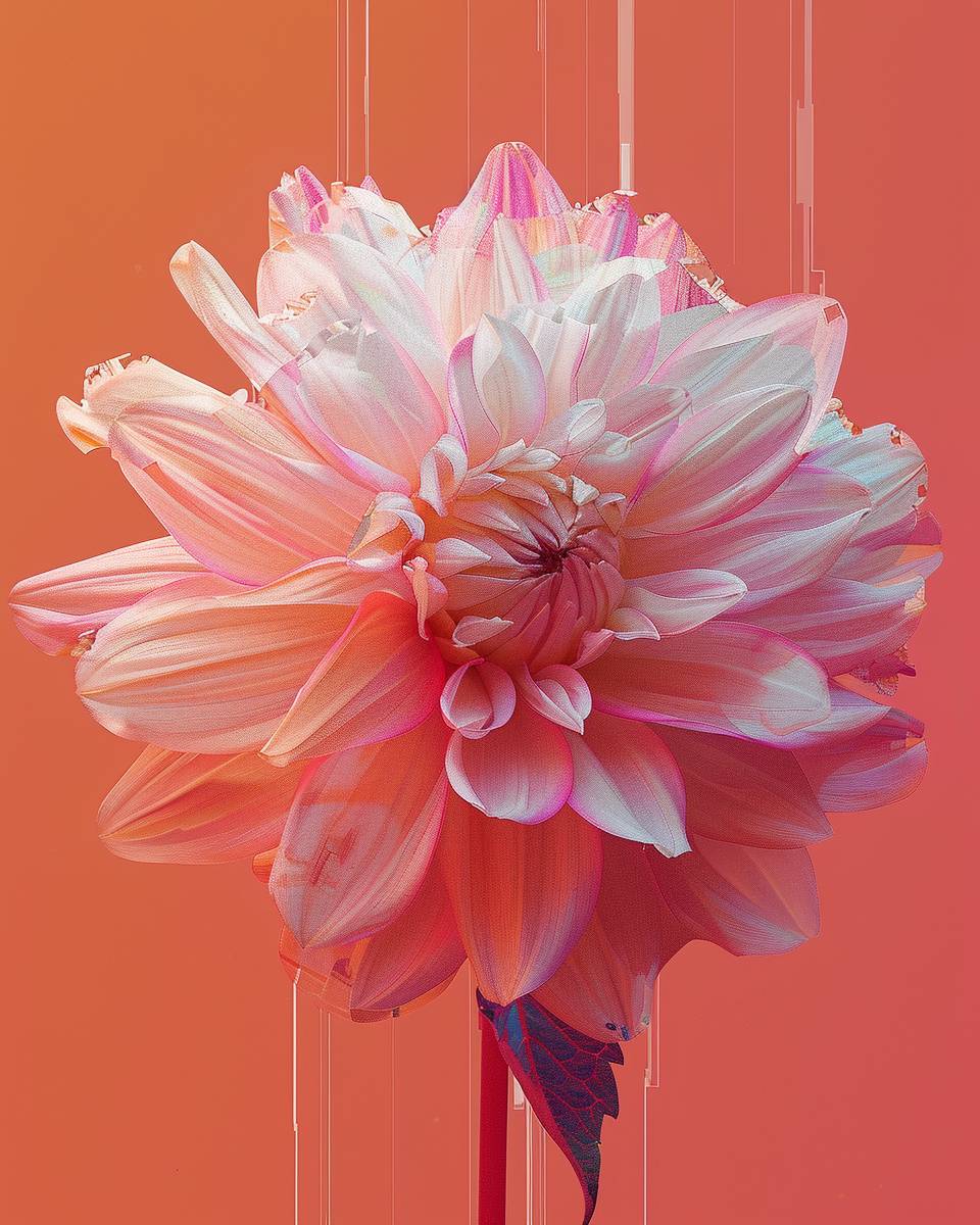 photo of pink and white glitched Dahlia, against linear datamoshing dark-pink-orange background, in the style of tropical sunset by the ocean --s 200 --ar 4:5 --v 6.0