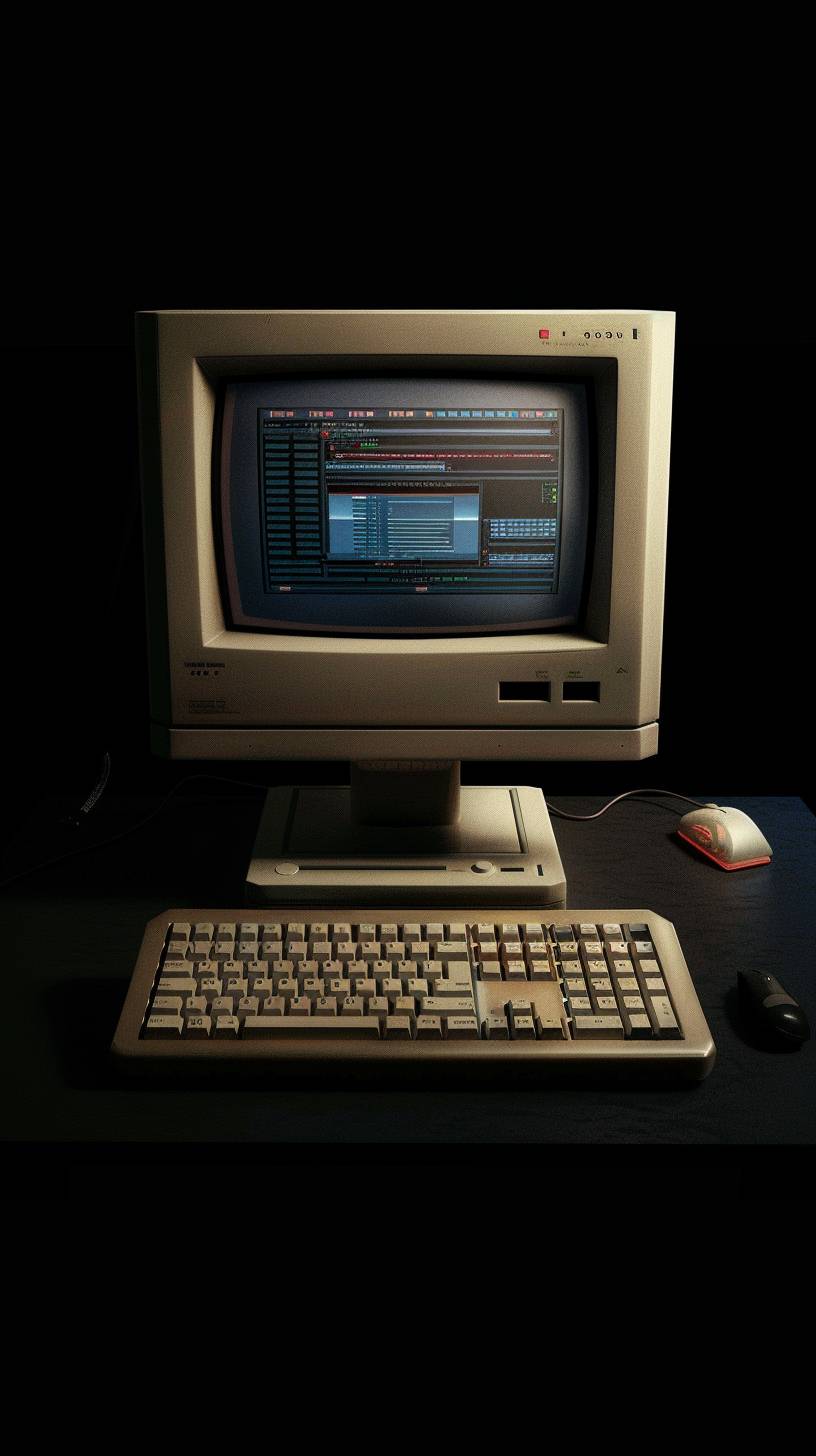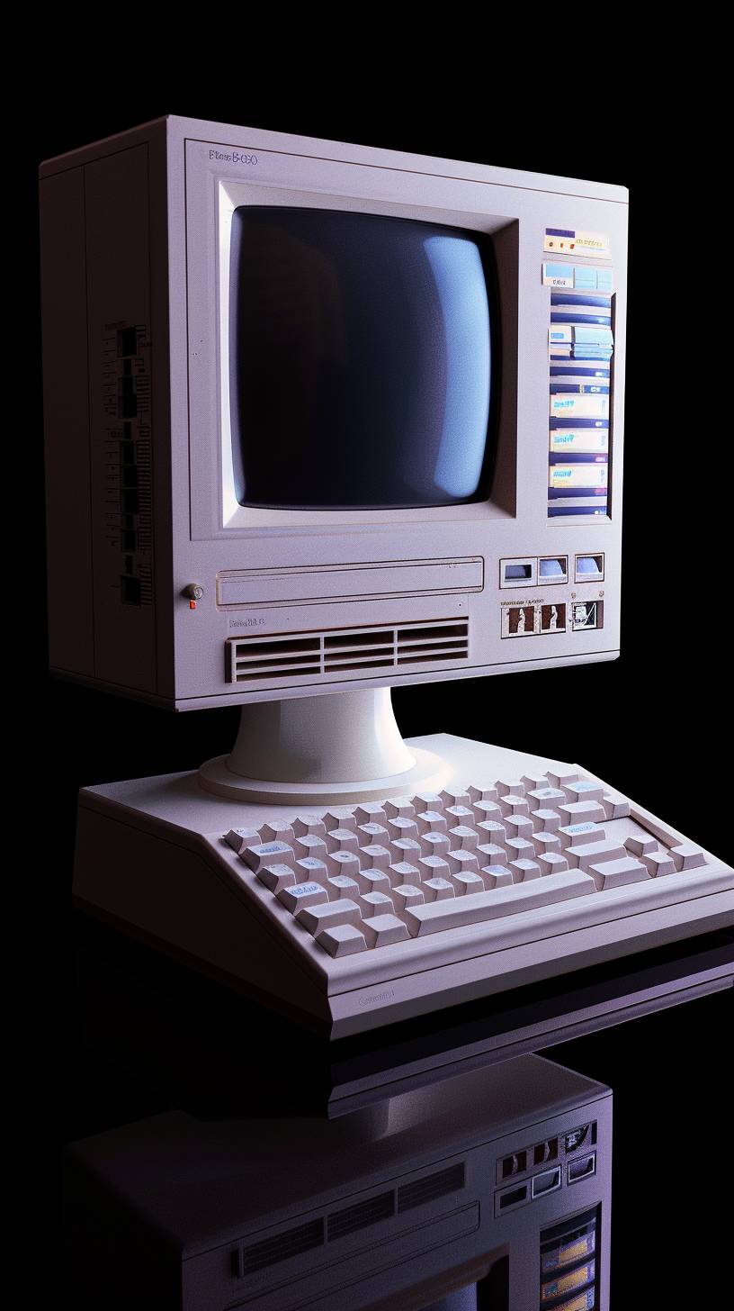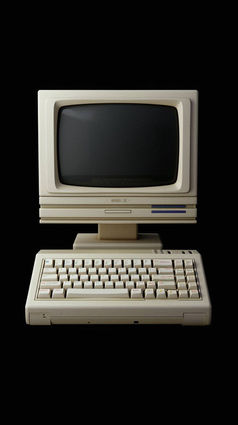 oldschool pc of a 90s, with design software on it. Separeted object, viewed from the front on black background. --ar 9:16 --v 6.0