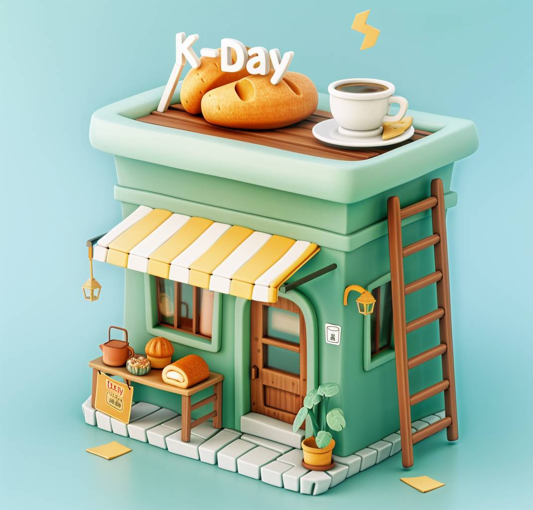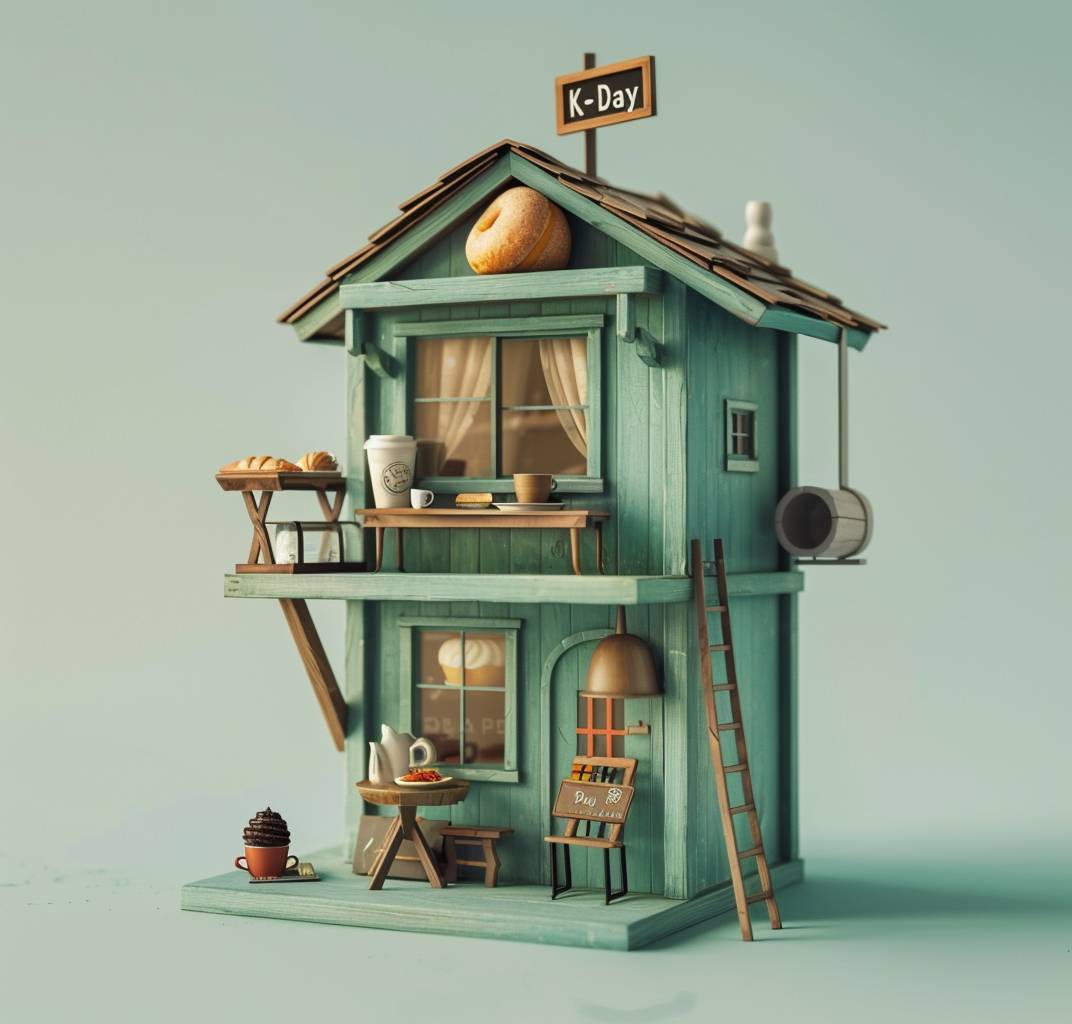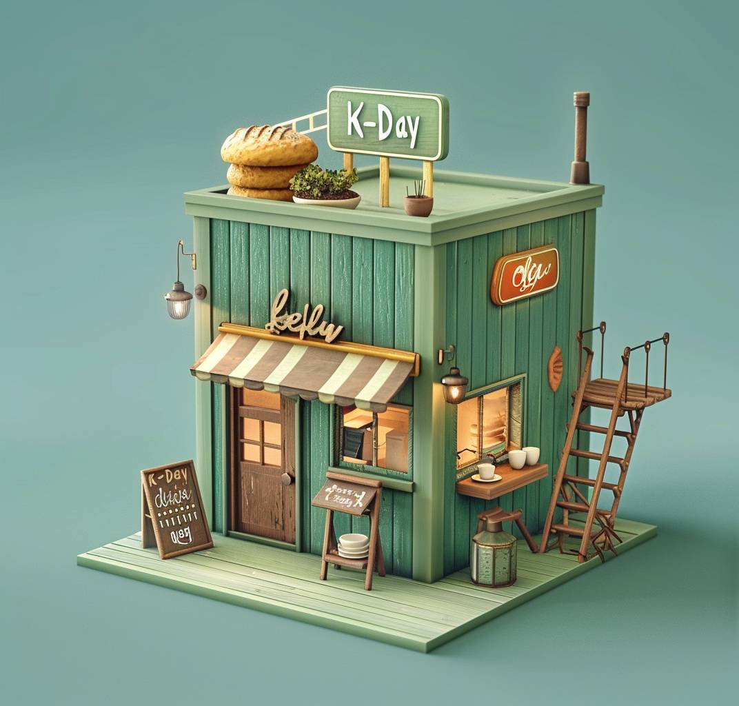 緑の木材で作られた可愛らしいカフェの3Dモデル。屋根の上にはパンとコーヒーのカップがあり、二階に行くために木の梯子が側面の壁に寄りかかっている。「K-Day」の看板が左上隅にあり、アニメーションスタイルの等角視点。紙を切り抜いて作ったような工芸品で、紙の質感、シンプルな背景、スタジオ照明、Octaneレンダリング。