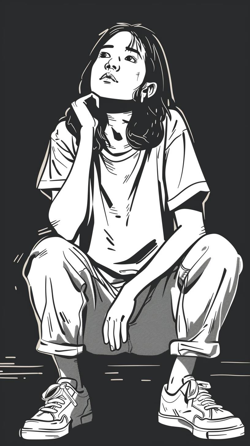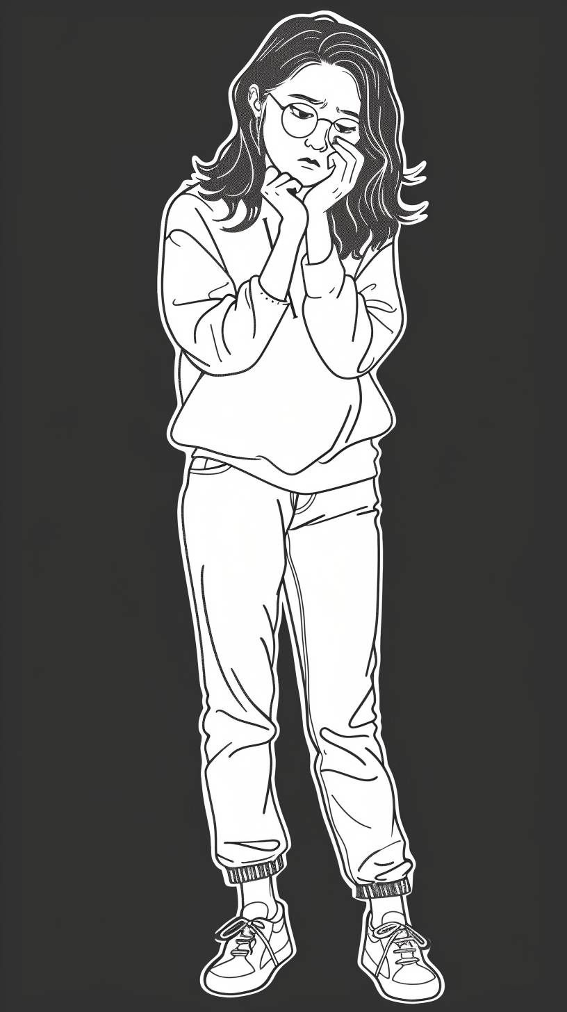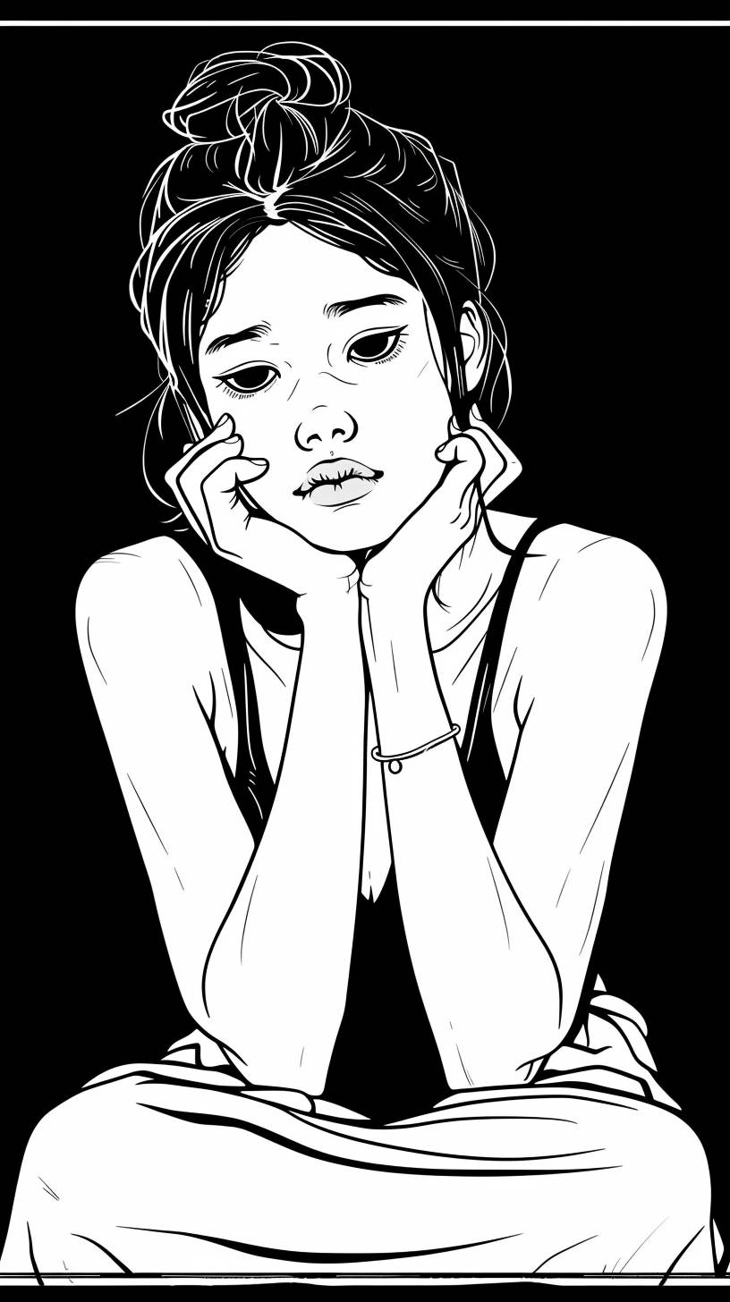 coloring pictures sad asian woman Thinking of something on Black background, cartoon style with clear borders. . full body --ar 9:16 --v 6.0