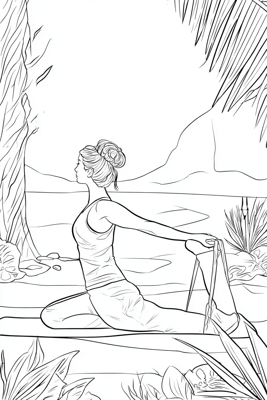 手描きの白黒輪郭の大人の塗り絵本。手描きのシンプルな塗り絵用の線画、床に座ってヨガストラップでストレッチする人物、最小限の部屋の詳細、影なしの黒白線画スタイル。大人の塗り絵ページの主な焦点として、明確で太い滑らかな線、影なし、クロスハッチングなし、塗り絵に適した開いたスペース。シーンを精神的で落ち着いたものに感じさせるために。人物の輪郭は太くてきれいで、はっきり目立ちます。