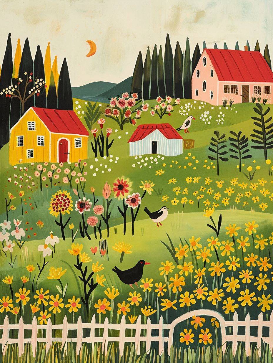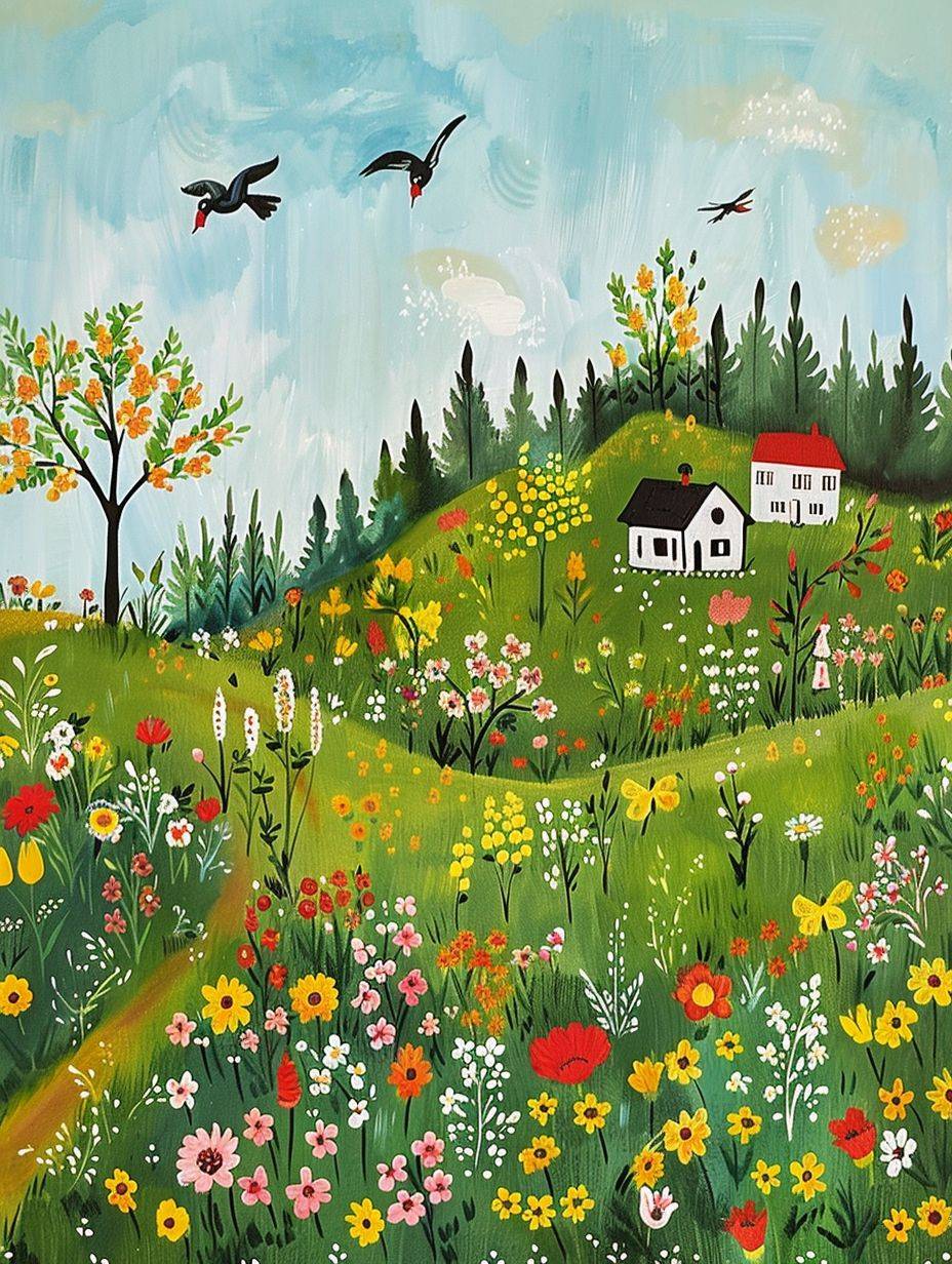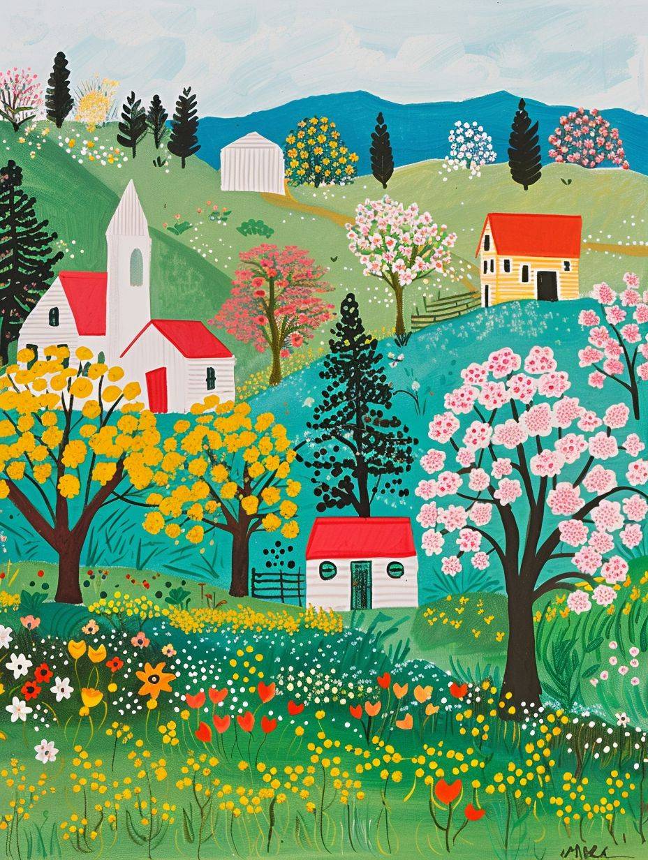 Spring meadow, folk art by Maud Lewis. --ar 3:4