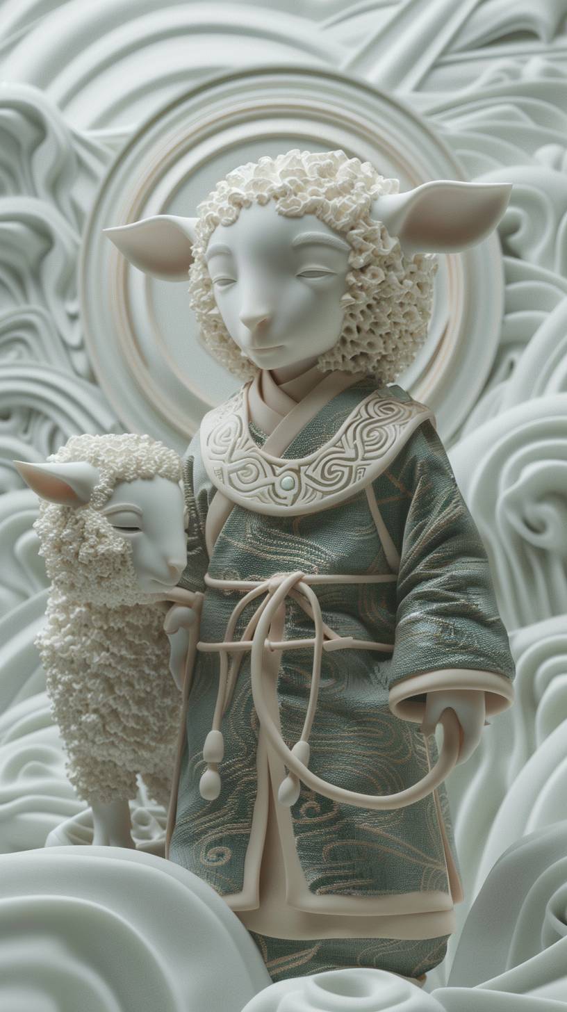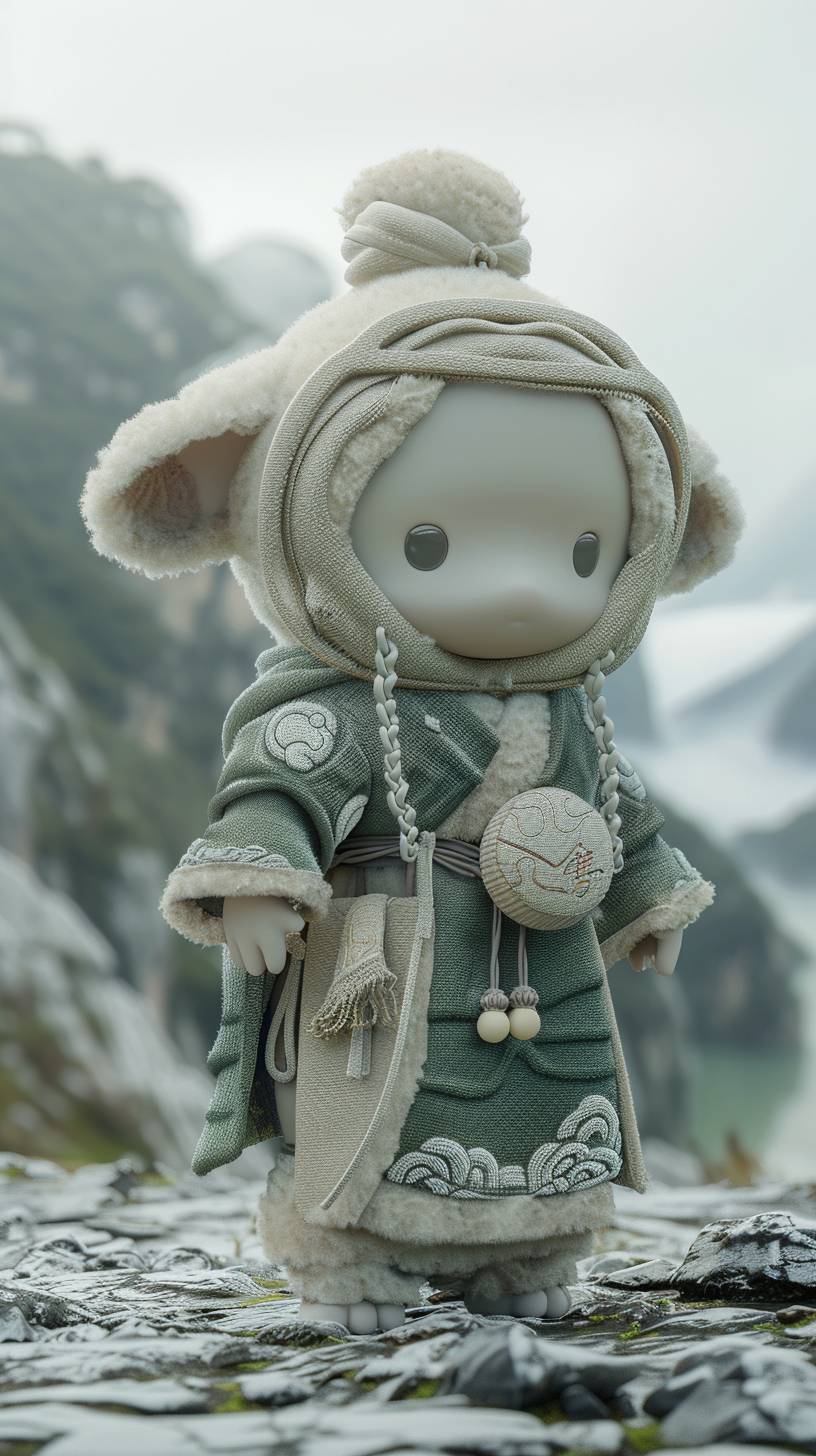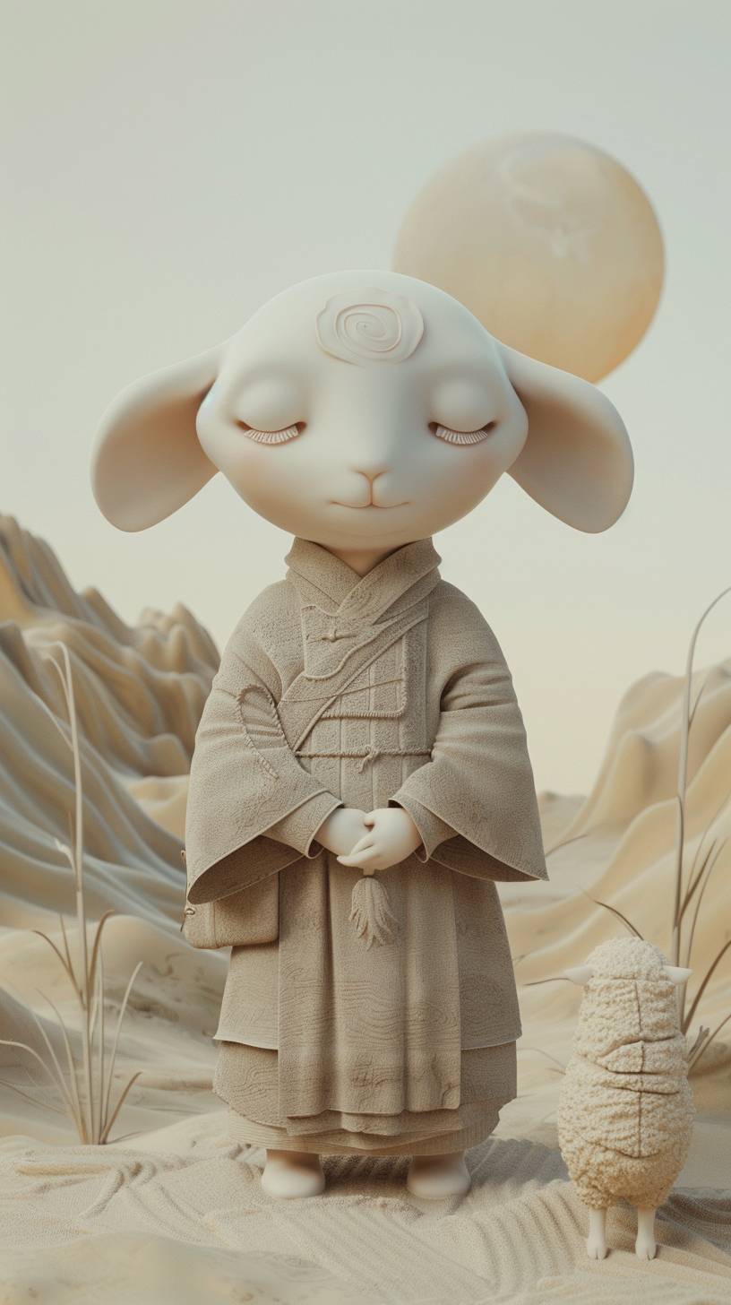 rcadia Mountains and Seas Sutra Chinese Legend white sheep A cute little sheep, Wuxia dressed in khaki Chinese Hanfu, 3d geometric, closeup. james turrell. zaha, background. minimal, minimal. contemporary art.surrealism. c4d Big eyes, pop mart Chinese Culture,zBrush, full Body Portrait, --ar 9:16 --v 6.0