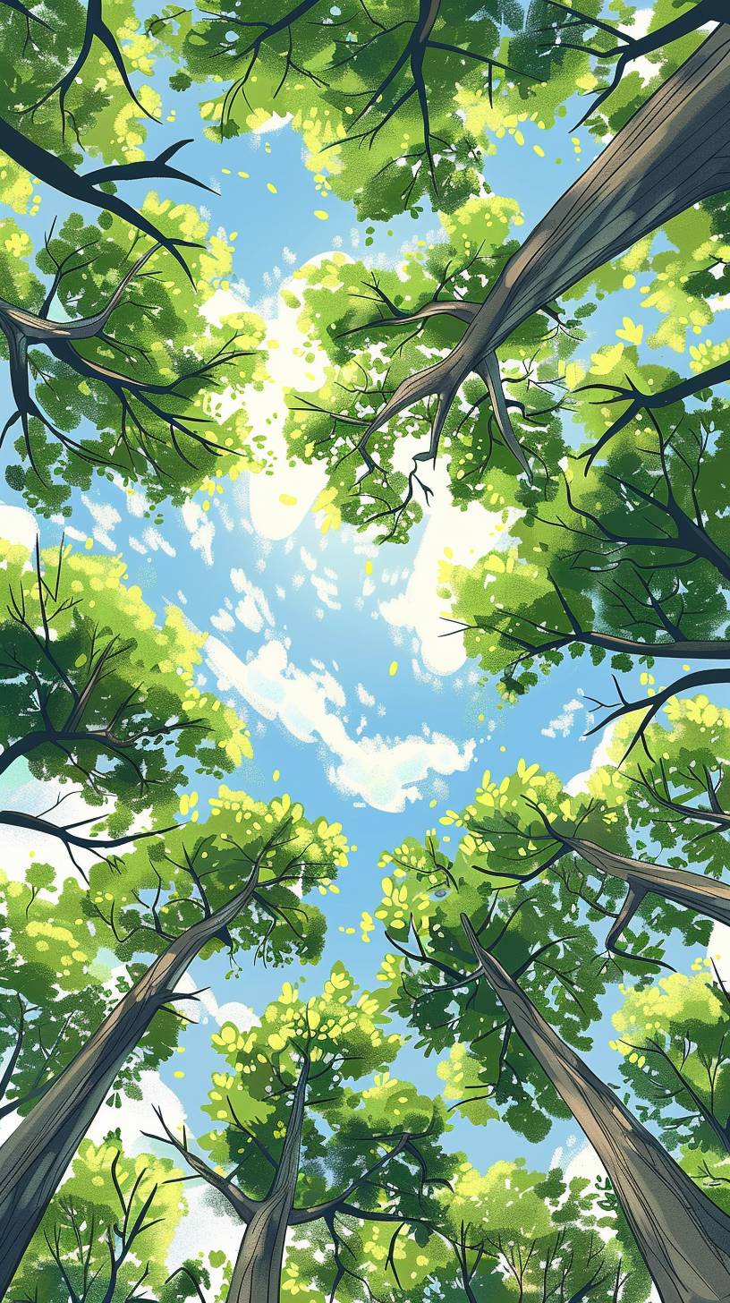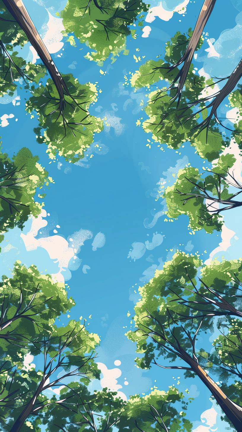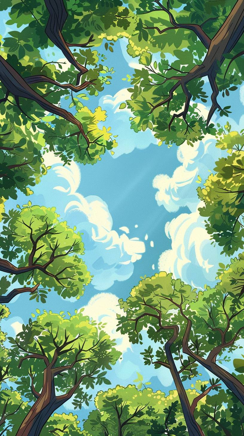 A sky view of trees with green leaves, in the style of a children's book illustration, with flat colors, in a wide angle --ar 9:16 --v 6.0