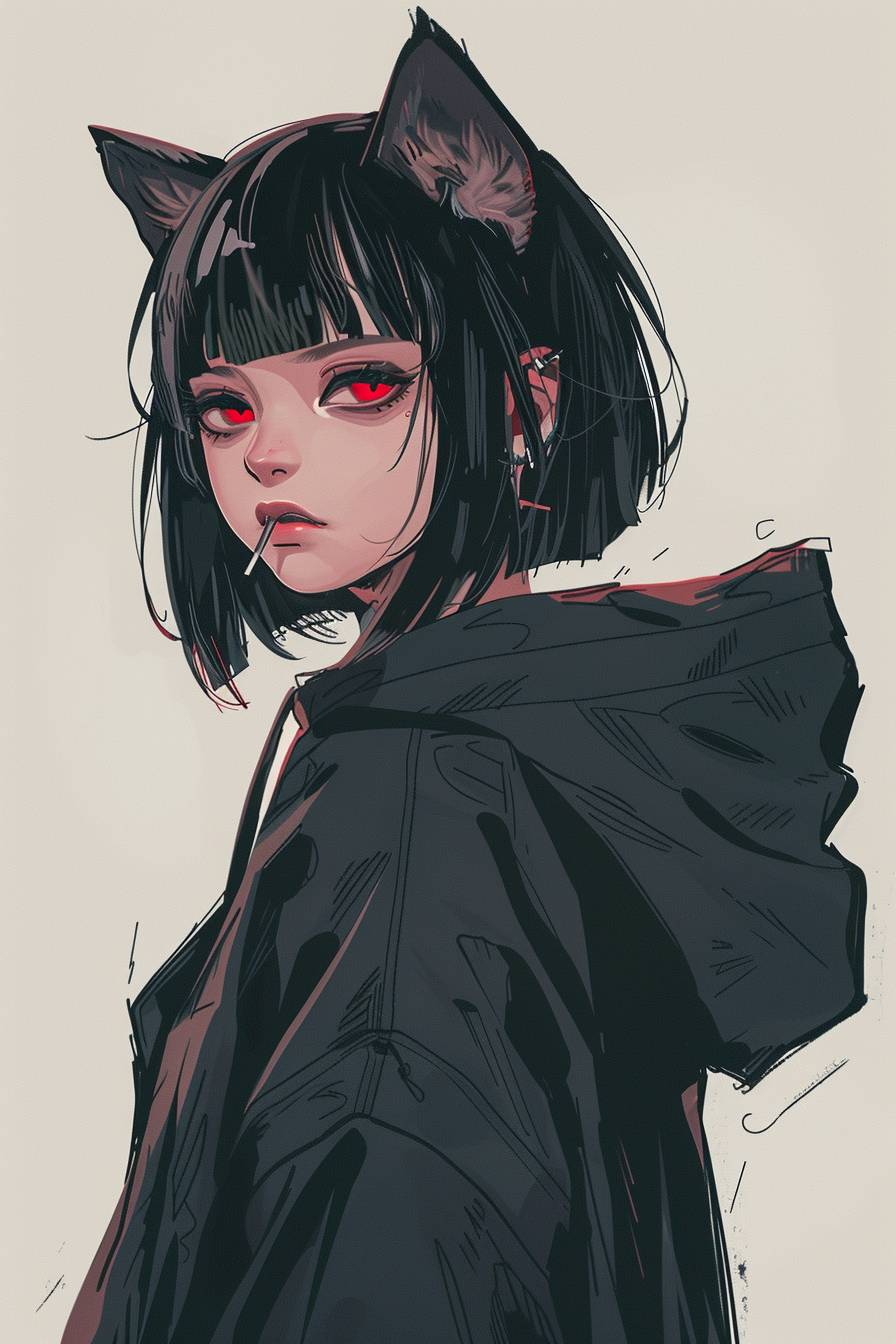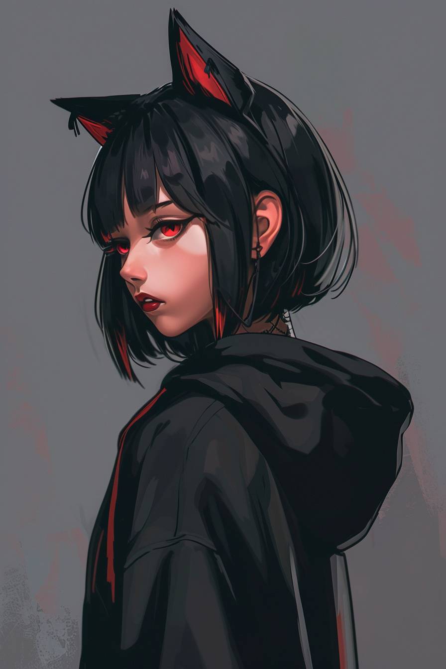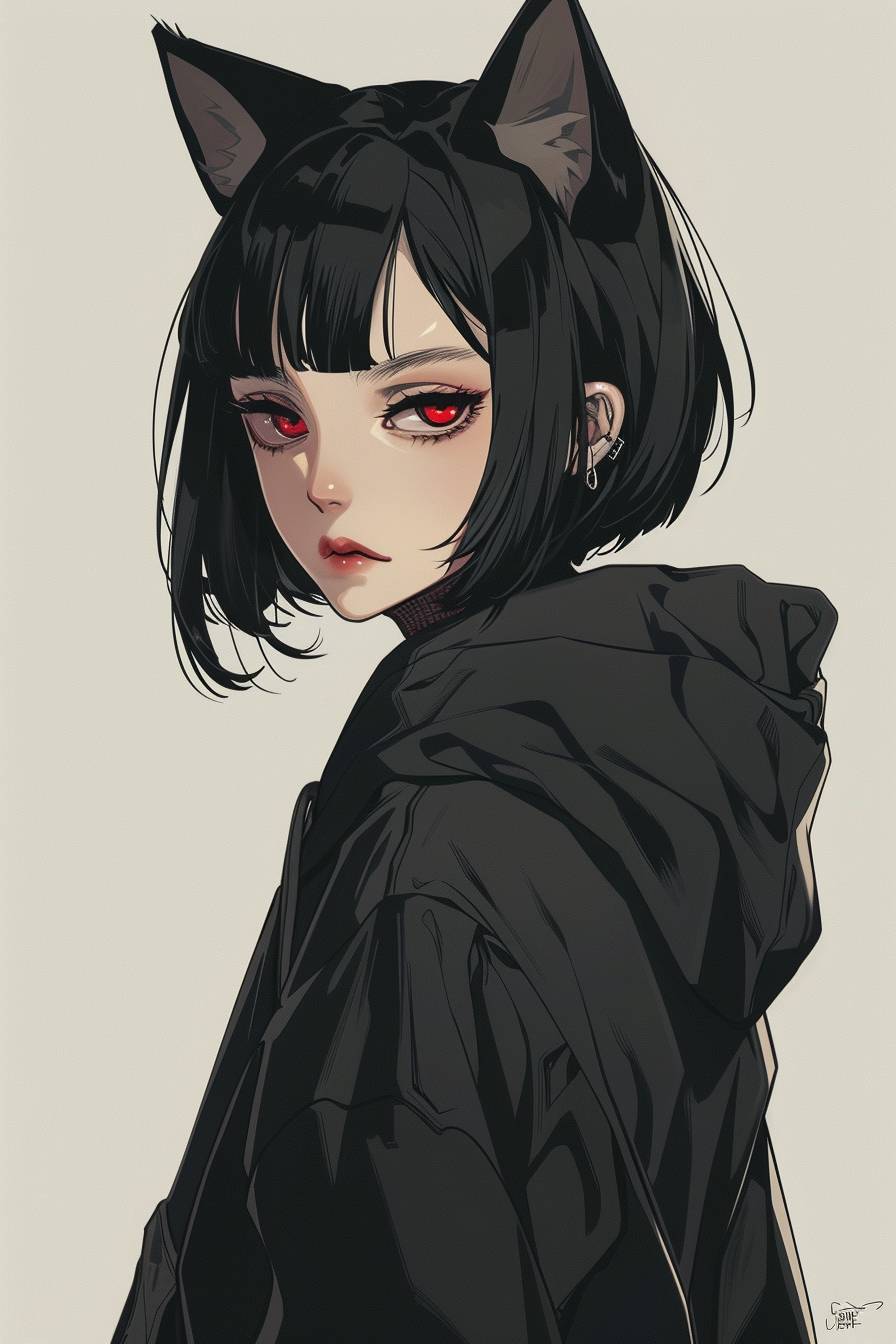 アニメの中の優雅な中国の少女、黒い猫耳、短い黒い髪、赤い目、ファッショナブルなサイバーパンクの黒いフーディージャケットを着て、悪戯な笑みを浮かべ、横から後ろを振り向き、上から見下ろす、シンプルな背景、カラフルなY2K美学。