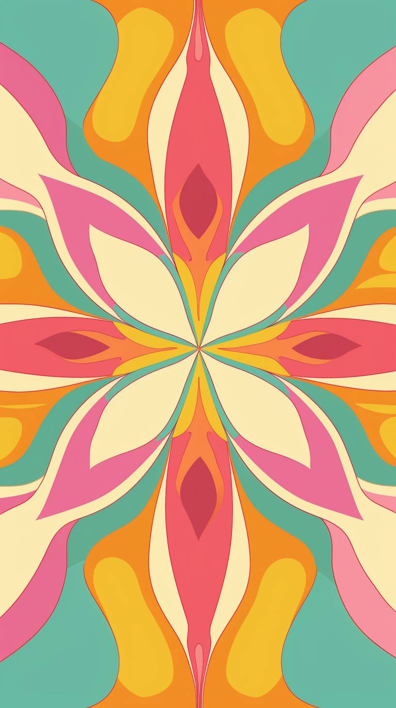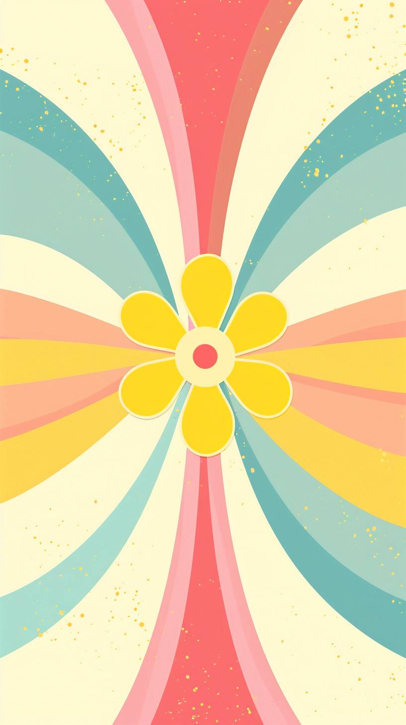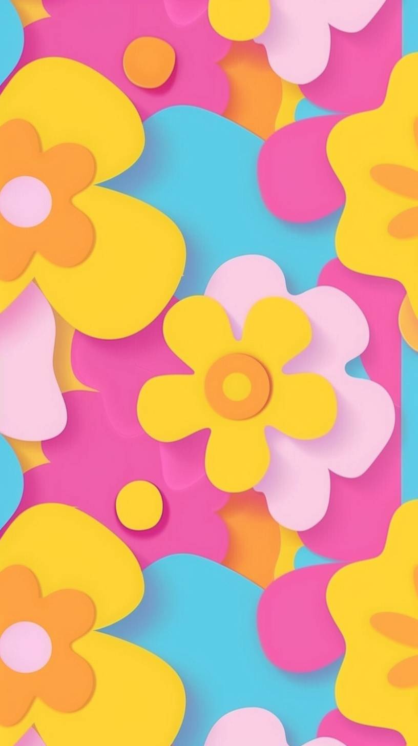 A retro groovy background design in Hot Pink, Lemon Yellow, and Sky Blue colors with flower shape patterns, vector illustration, flat style, simple shapes, 70s feel, symmetrical patterns in the style of 70s feel. --chaos 10 --ar 9:16 --style raw --stylize 50 --v 6.0