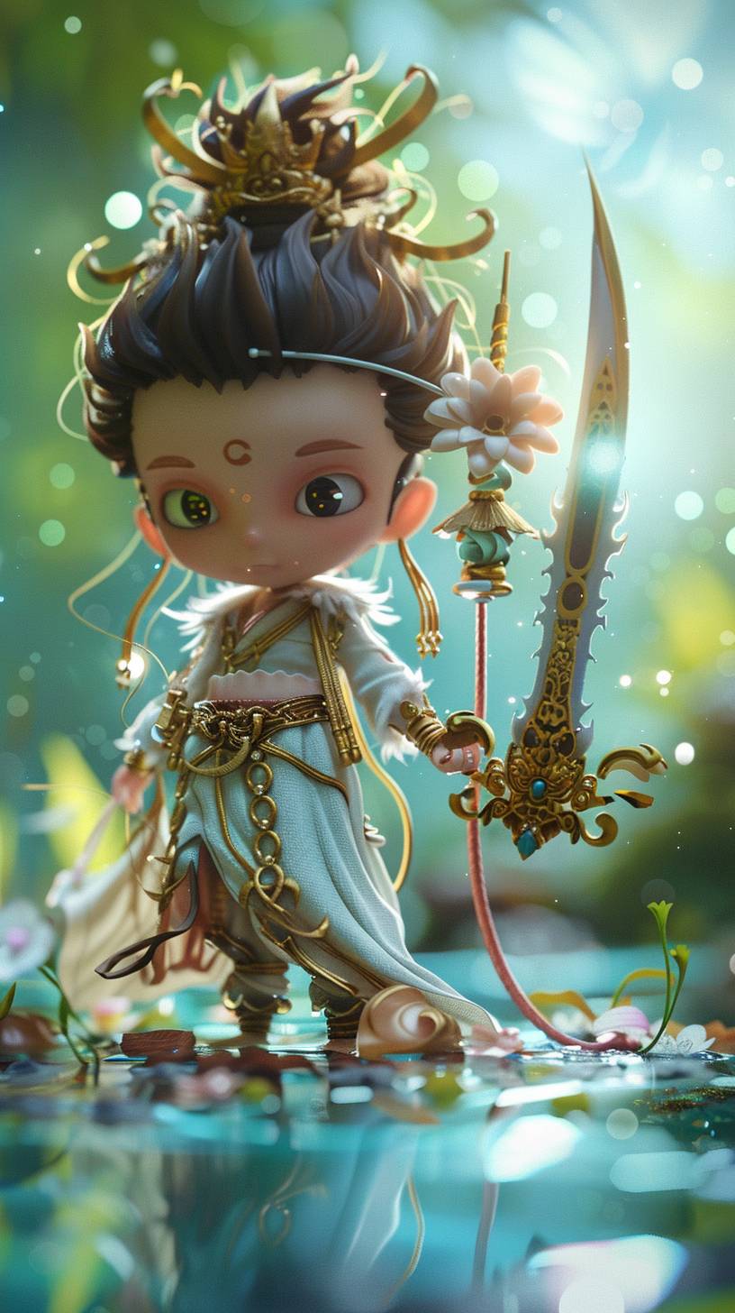 小さくてかわいい東洋の神話の神、幼い男の子が飛ぶ剣を持っていて、ブラインドボックス、可愛くてキュート、ハローバックグラウンド、ロマン主義、印象派、全身のレンズ、高い詳細、6k画像品質、C4Dモデル、高解像度と精度