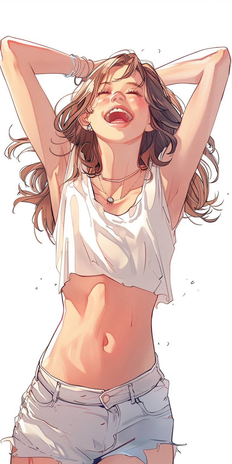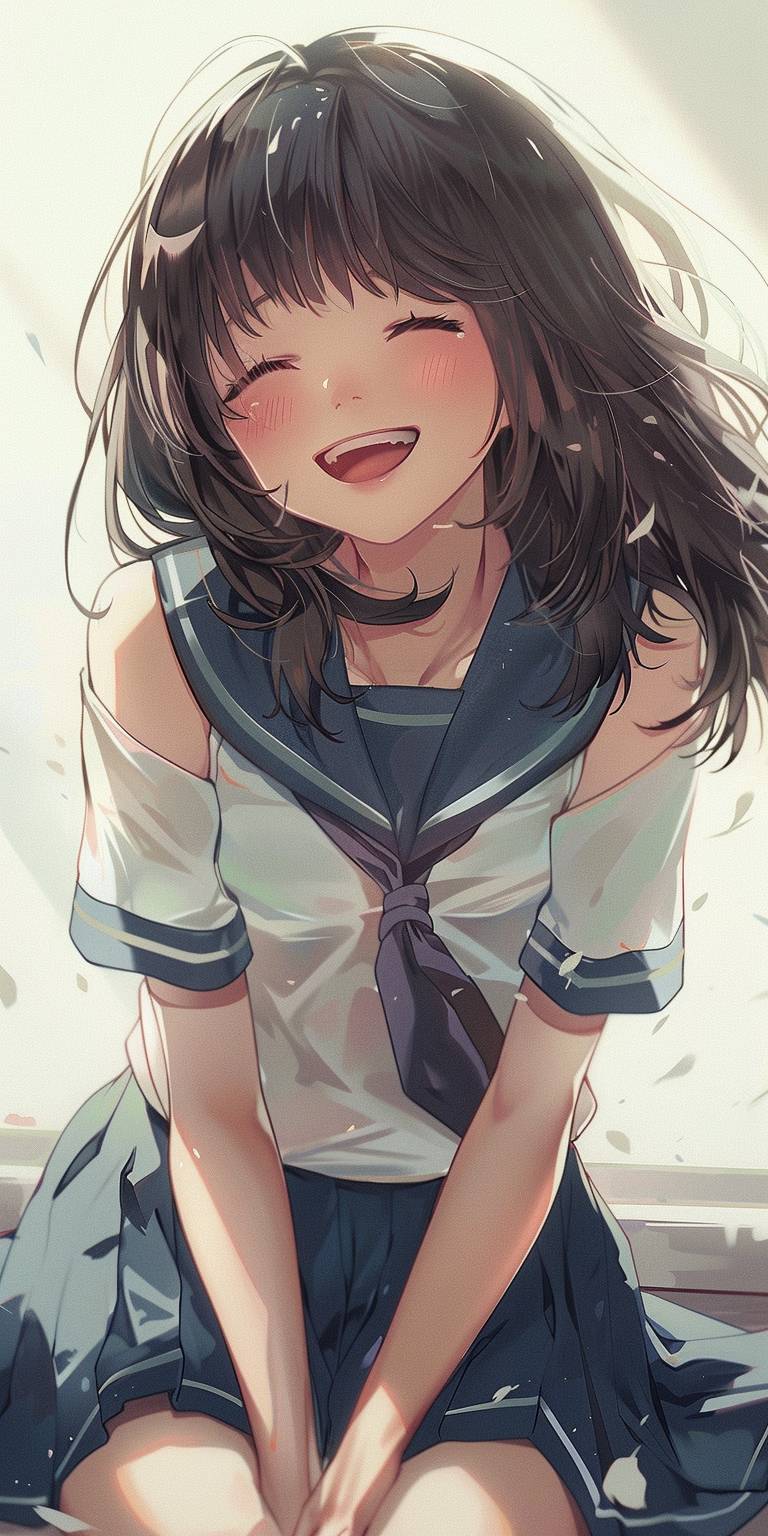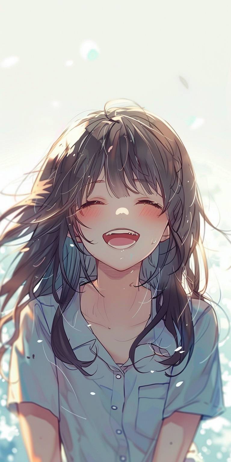 Anime, half length girl, laughing happily, high-definition picture quality, lovely and warm, fine line draft, fresh color, solid background, and white space above the screen --ar 1:2 --v 6.0