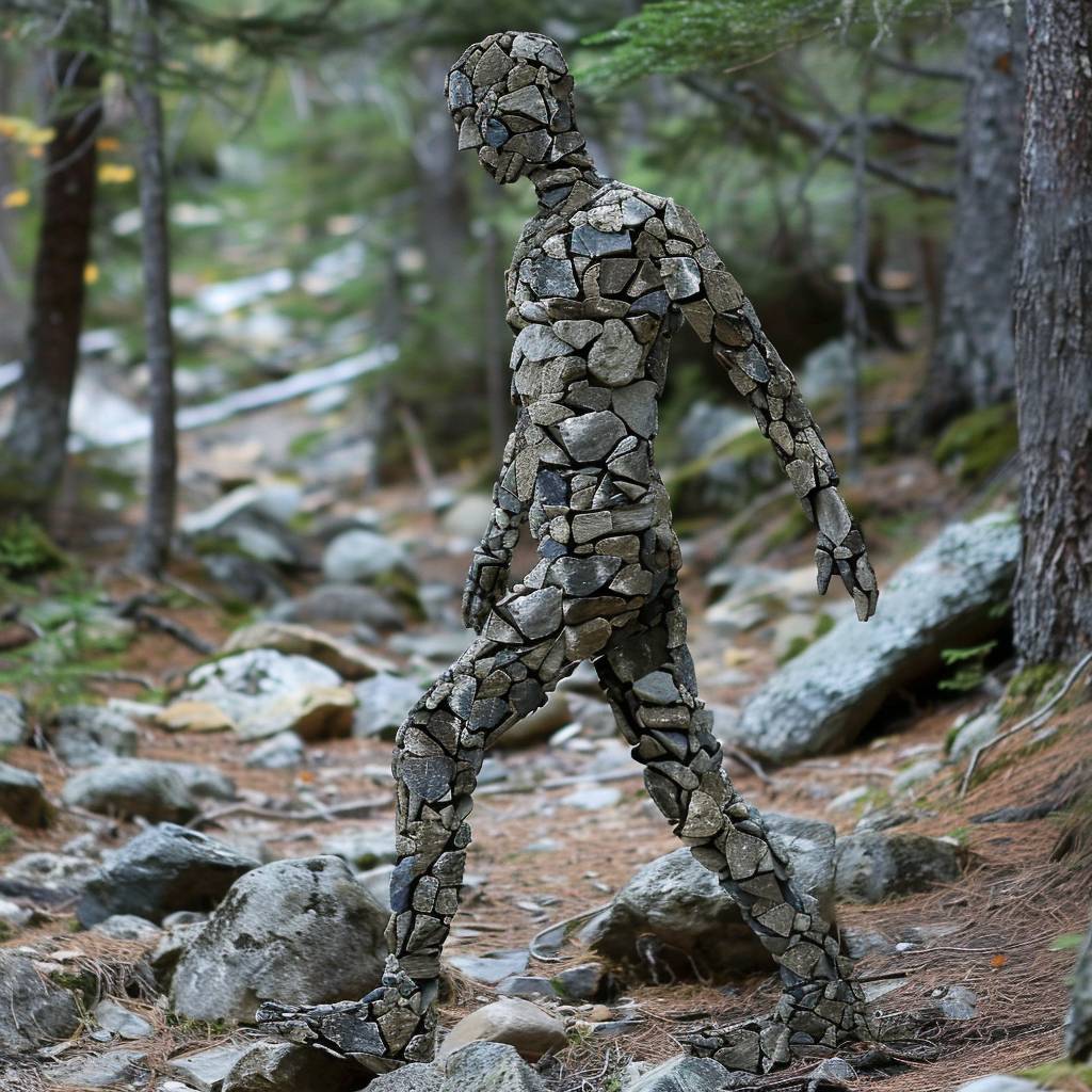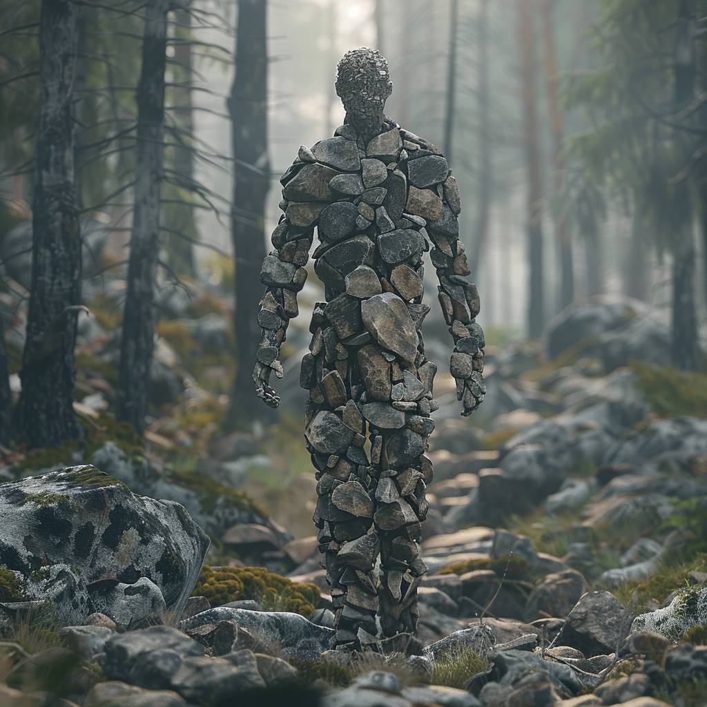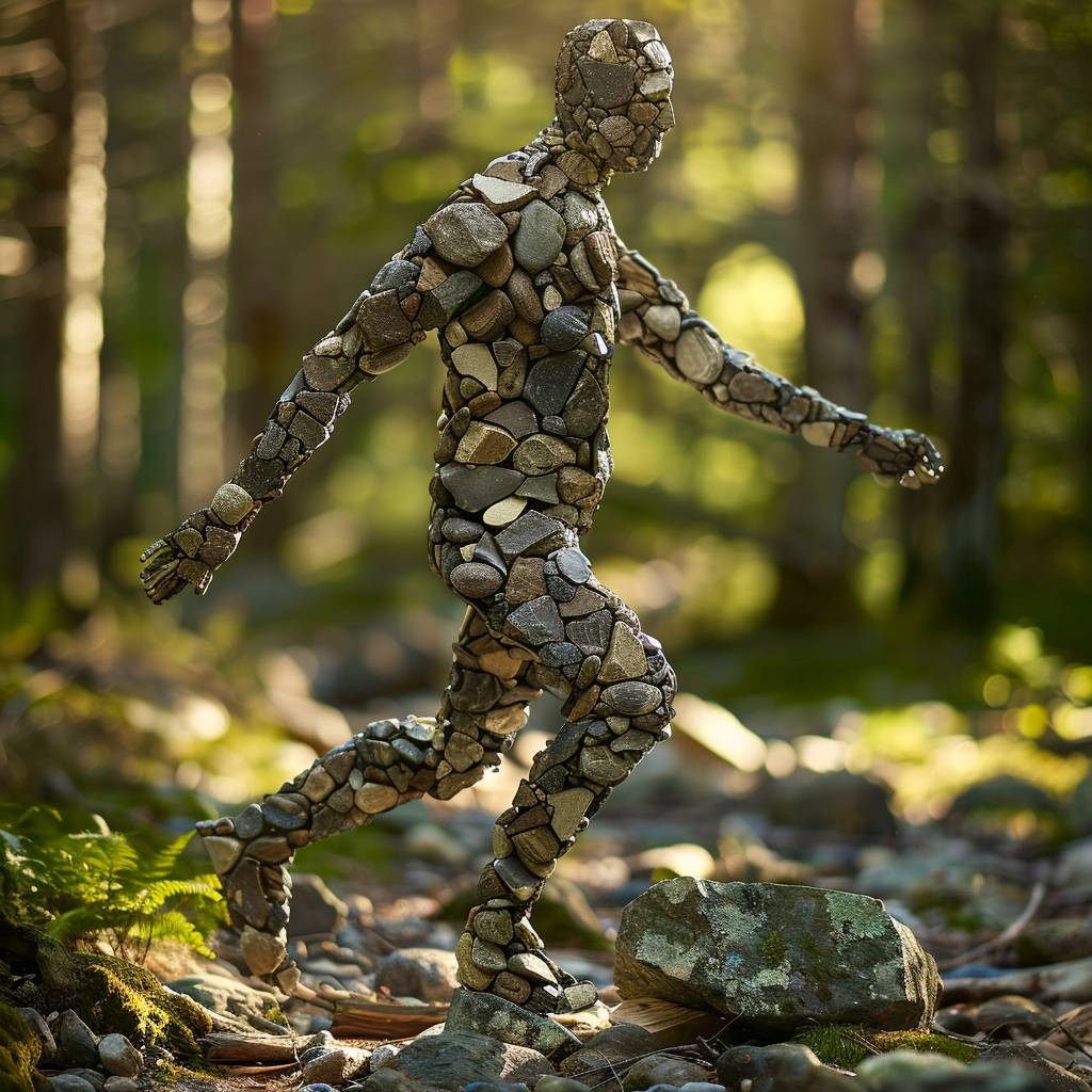 A man made of rocks walking in the forest, full-body shot. --v 6.0