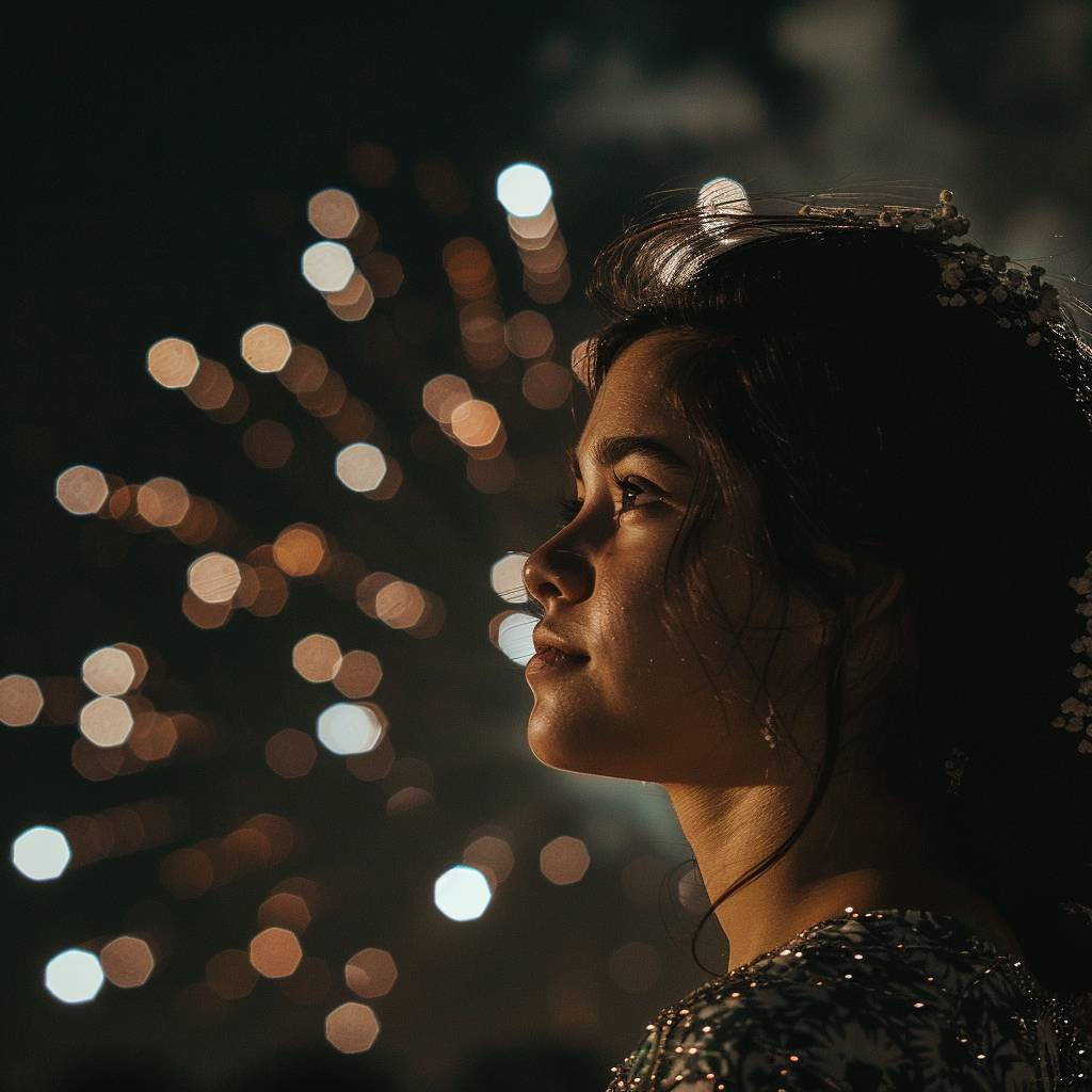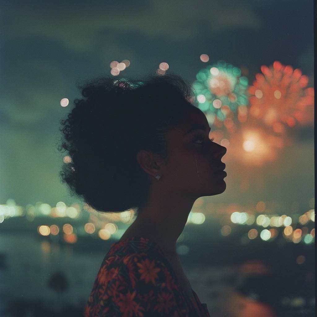A side profile shot of a woman with fireworks exploding in the distance beyond her. --v 6.0