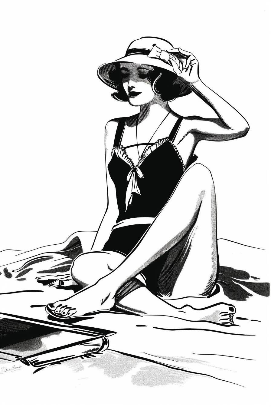 Jacques prevert illustration art, illustration girl on beach in 1930, 1930s, line draw, white simple background --ar 2:3 --stylize 50 --v 6.0