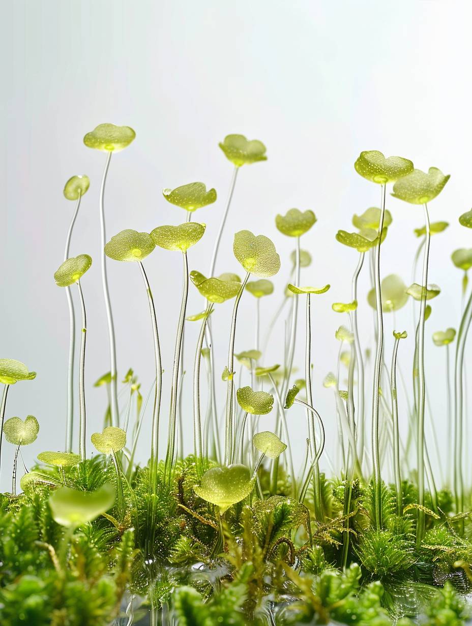 白い背景の前に透明な茎を持つRacomitrium canescensの苔、荒木飛呂彦のスタイルで、ガラス製で複雑なテクスチャー、ピーター・ブルーム、繊細なライン、優雅な曲線、大友康網、色の使用は控えめ。