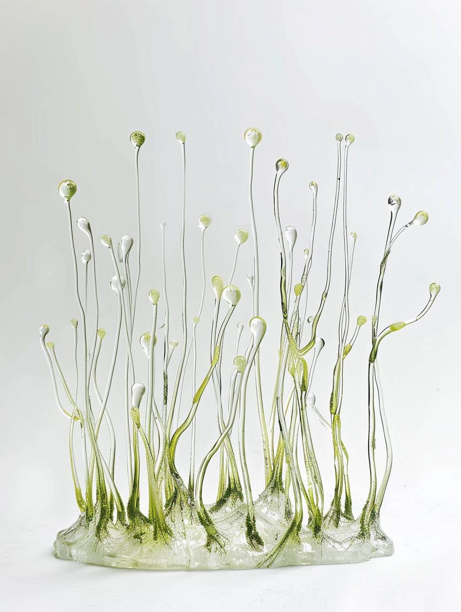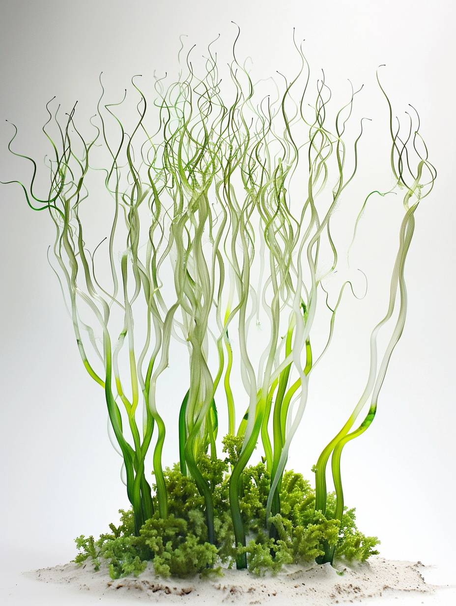 Racomitrium canescens moss with clear stems in front of a white background, in the style of hirohiko araki, made of glass, intricately textured, peter blume, fine lines, delicate curves, yasutomo oka, light use of color, white background --ar 3:4 --v 6.0