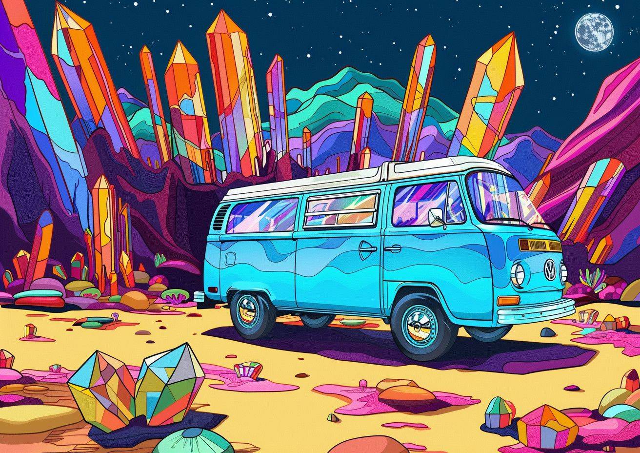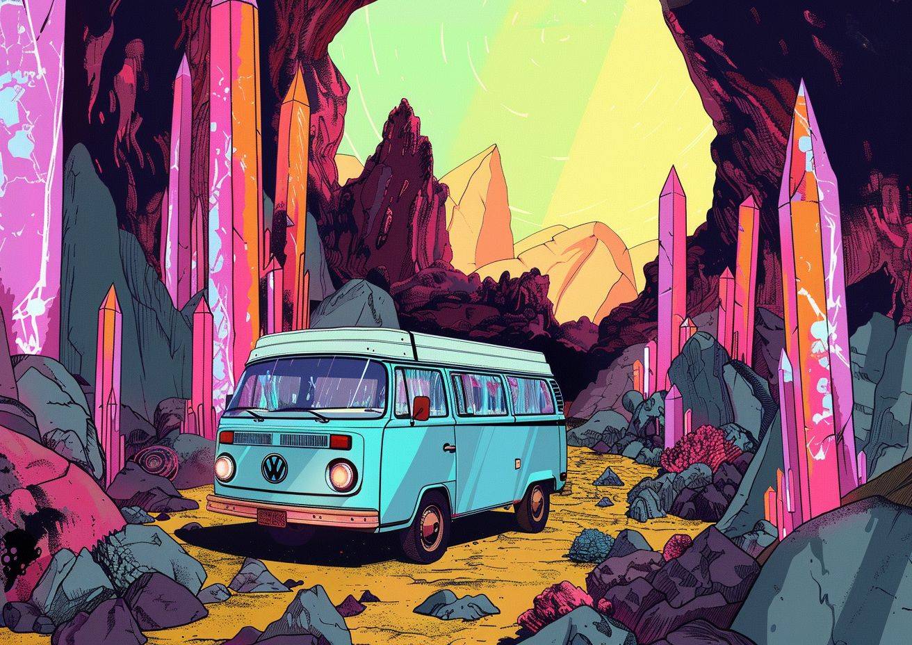 サイケデリックポップアート、鮮やかな色、クリーンなライン、ライトブルーの70年代のコンビバン、巨大なクリスタルの洞窟にある鍾乳石、カートゥーンスタイル、DMTアート、強いビジュアルフロー、平和と麻のシンボル